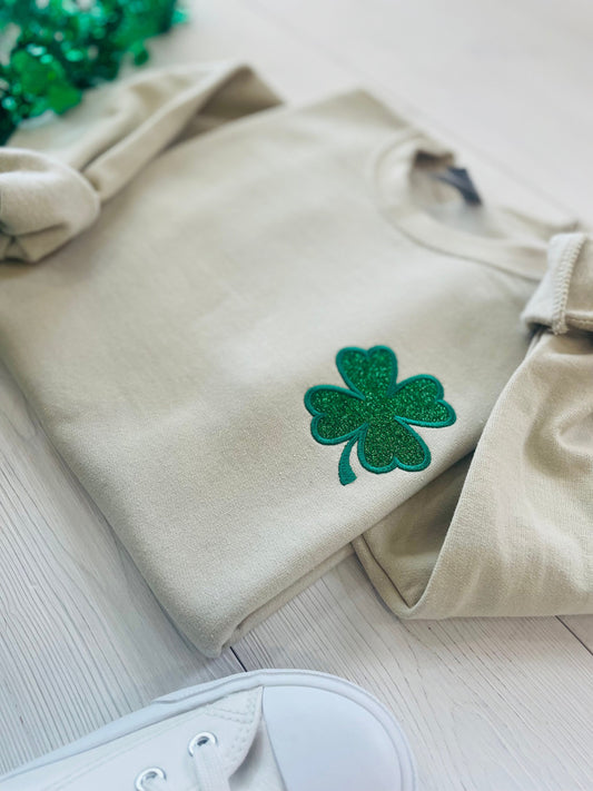 Pocket Glitter Embroidered Four Leaf Clover Sweatshirt