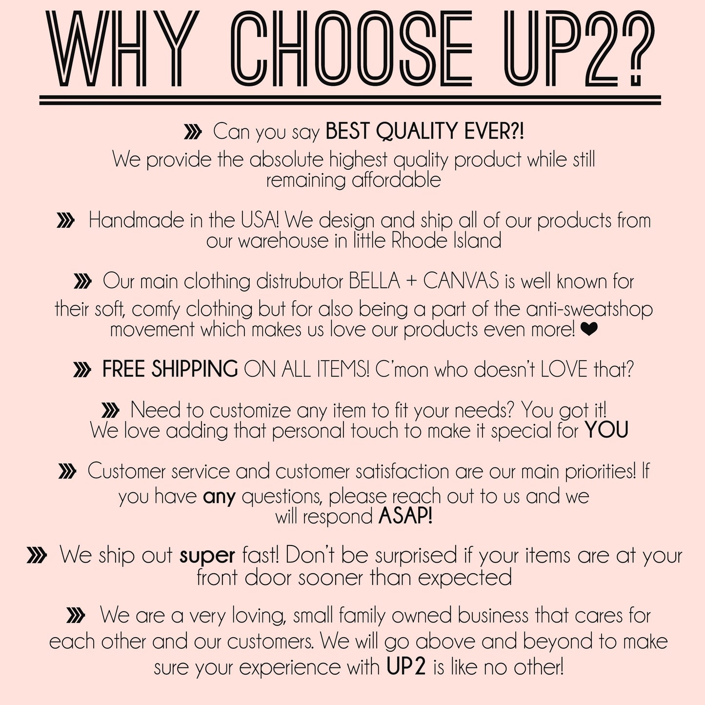 Up2 is your leading destination for all custom shirt printing needs! With over 8 years of experience in the industry, we’re experts at bringing your own customized vision to life through our efficient customization, printing, and fulfillment services. Whatever your needs, we're ready to make it happen!