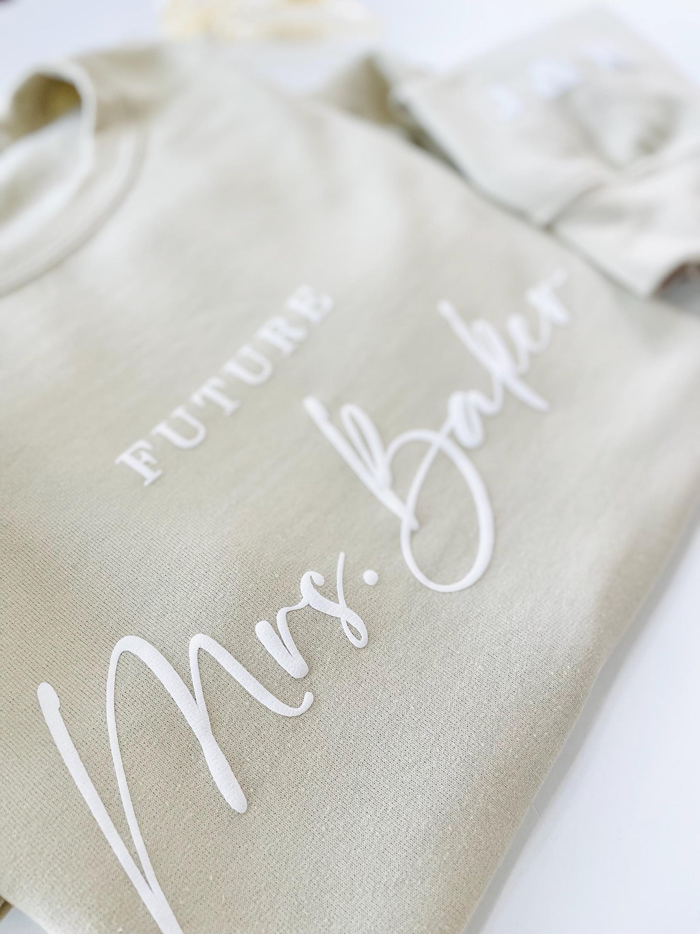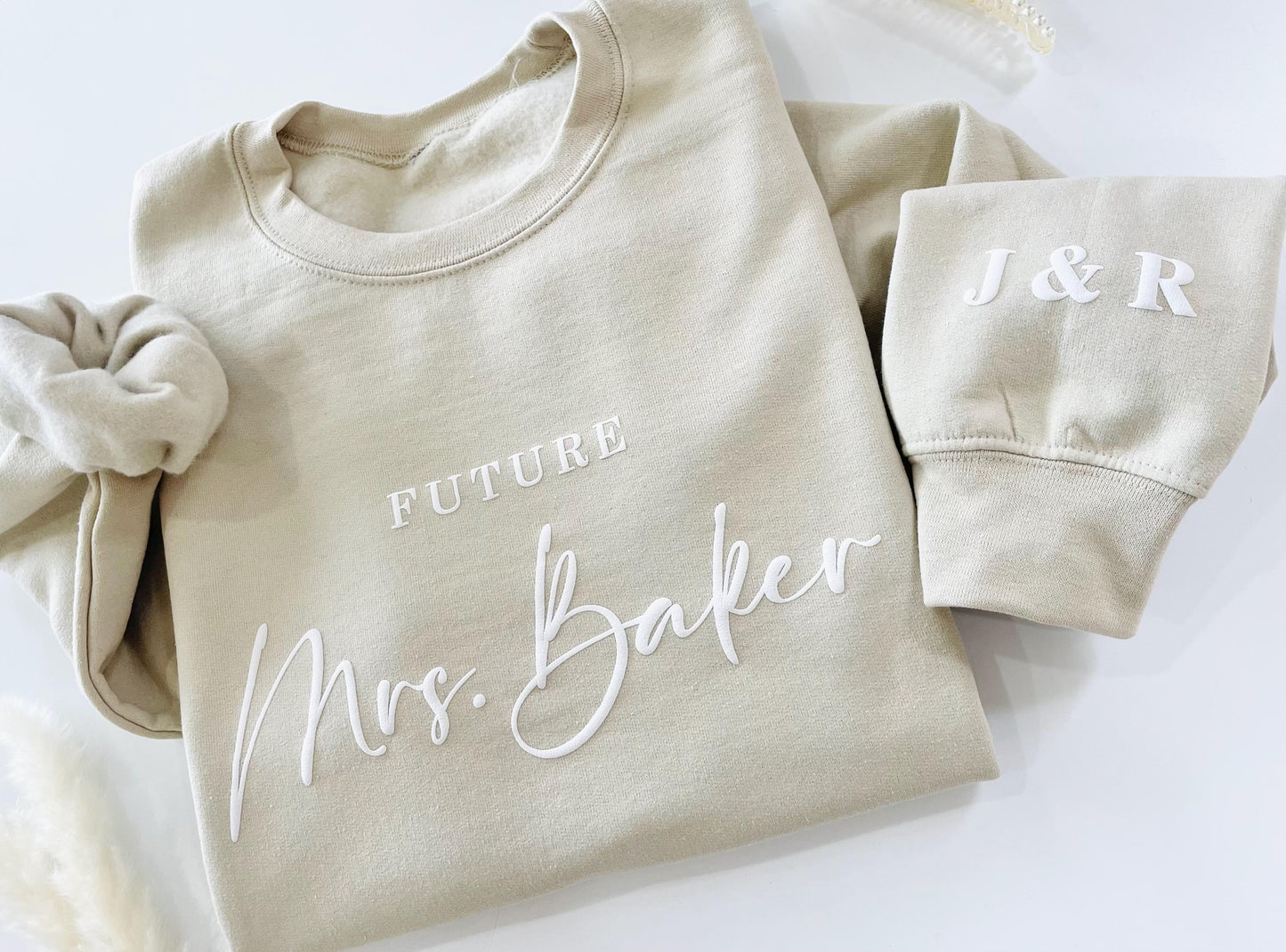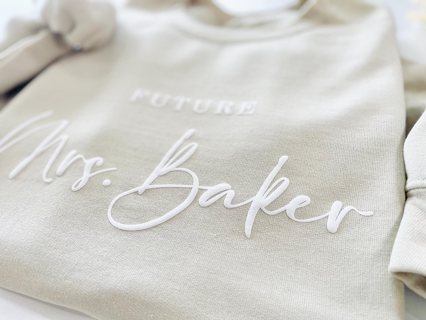 Elevate Your Bridal Style with Our Custom Embossed Mrs. Crewneck Sweatshirt