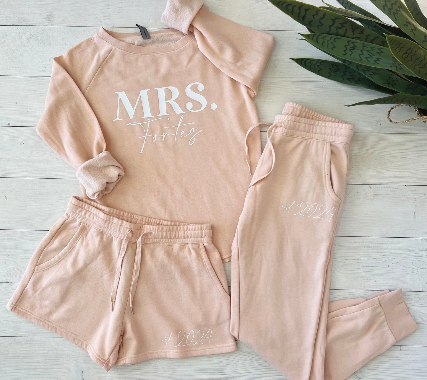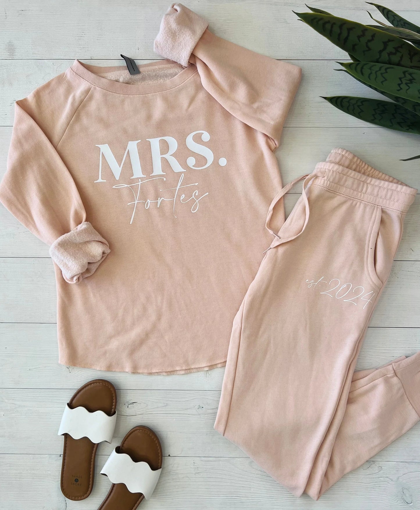 - Personalization: Customize your cozy sweatshirt with your new last name and add your wedding date to the matching pants for a truly unique look.
