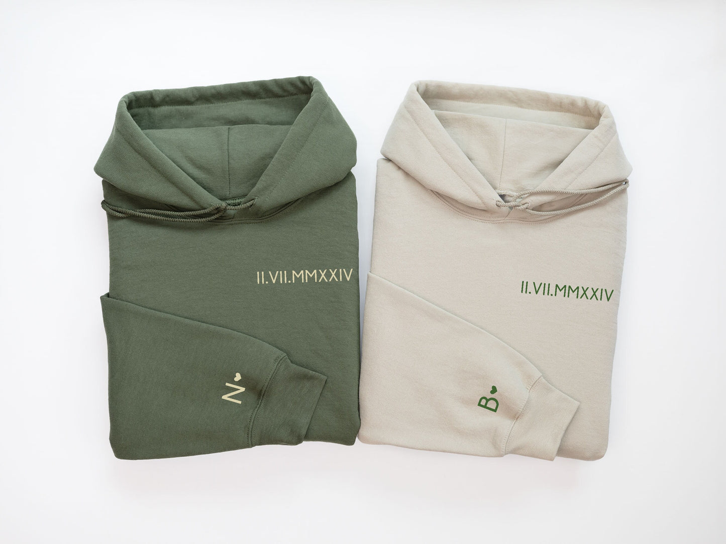 - Personal Touch: Add your wedding date in elegant Roman numerals and your initials on the sleeve, transforming these hoodies into cherished keepsakes that you’ll treasure forever.