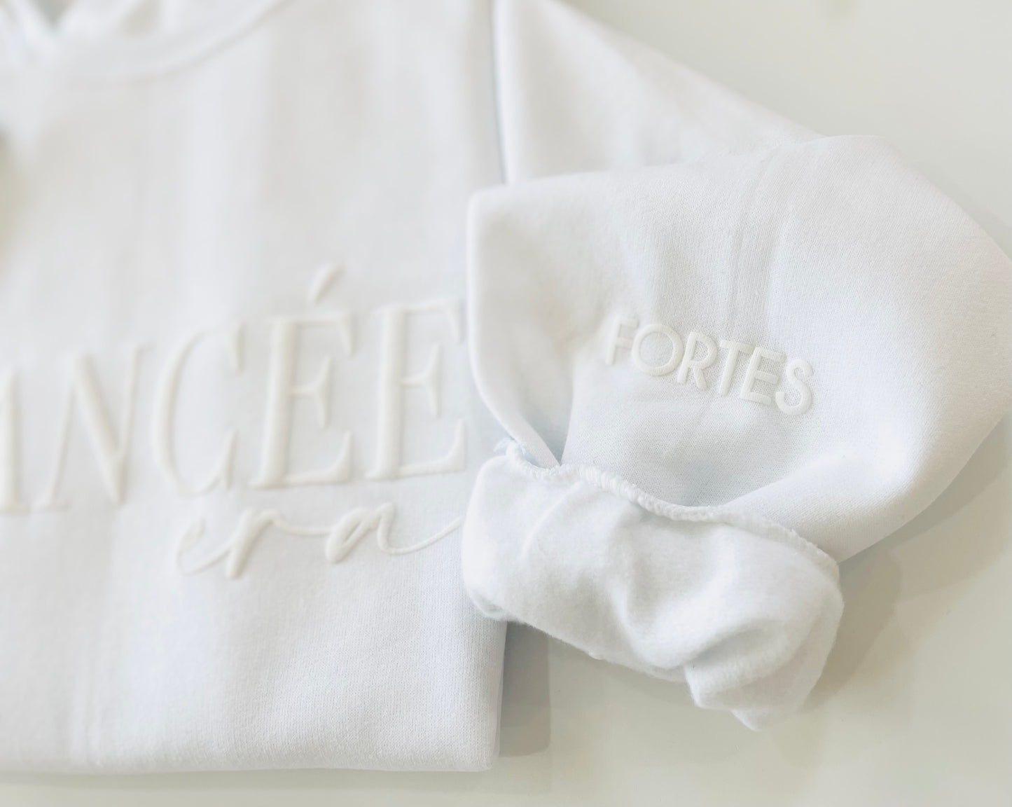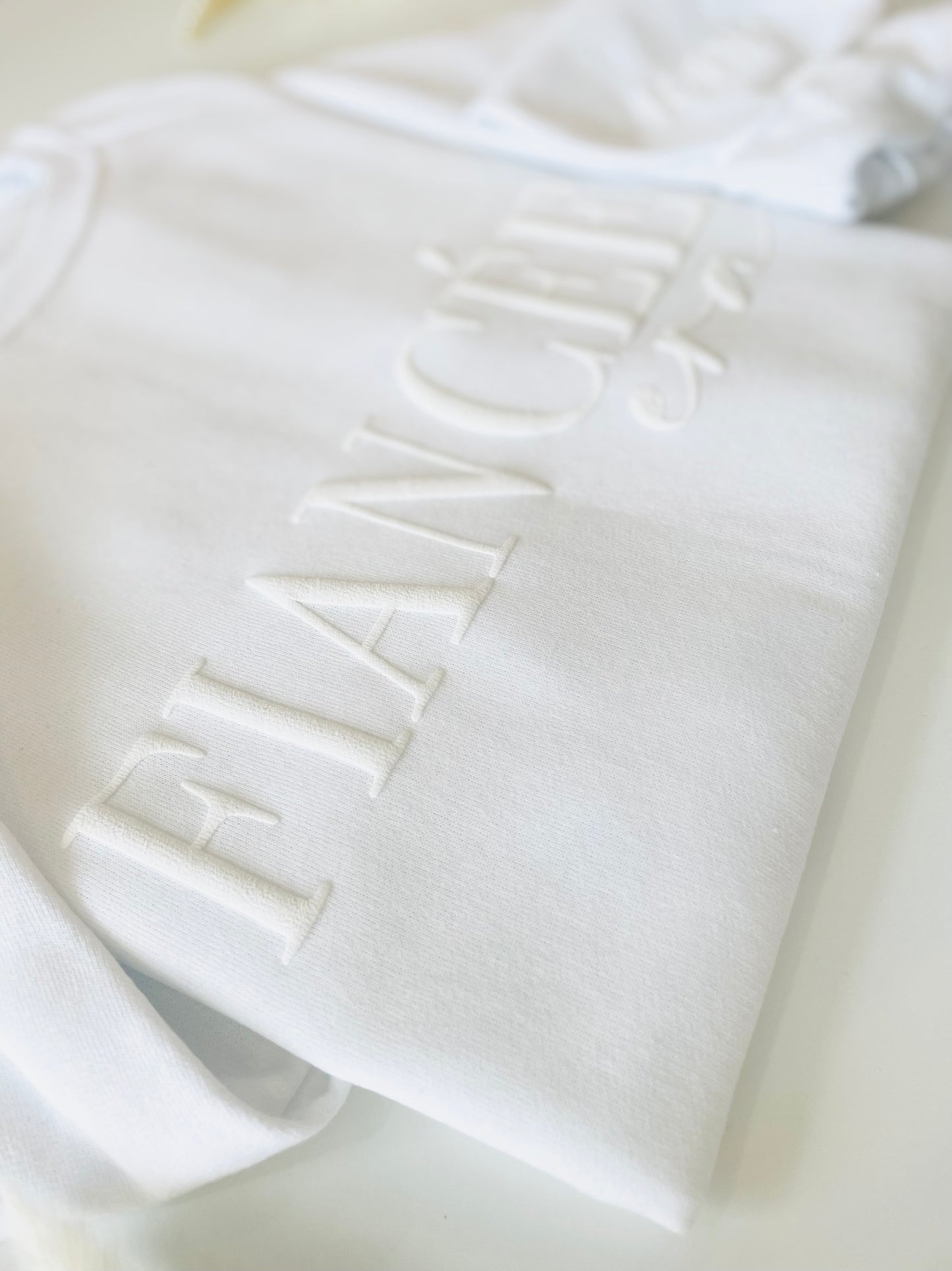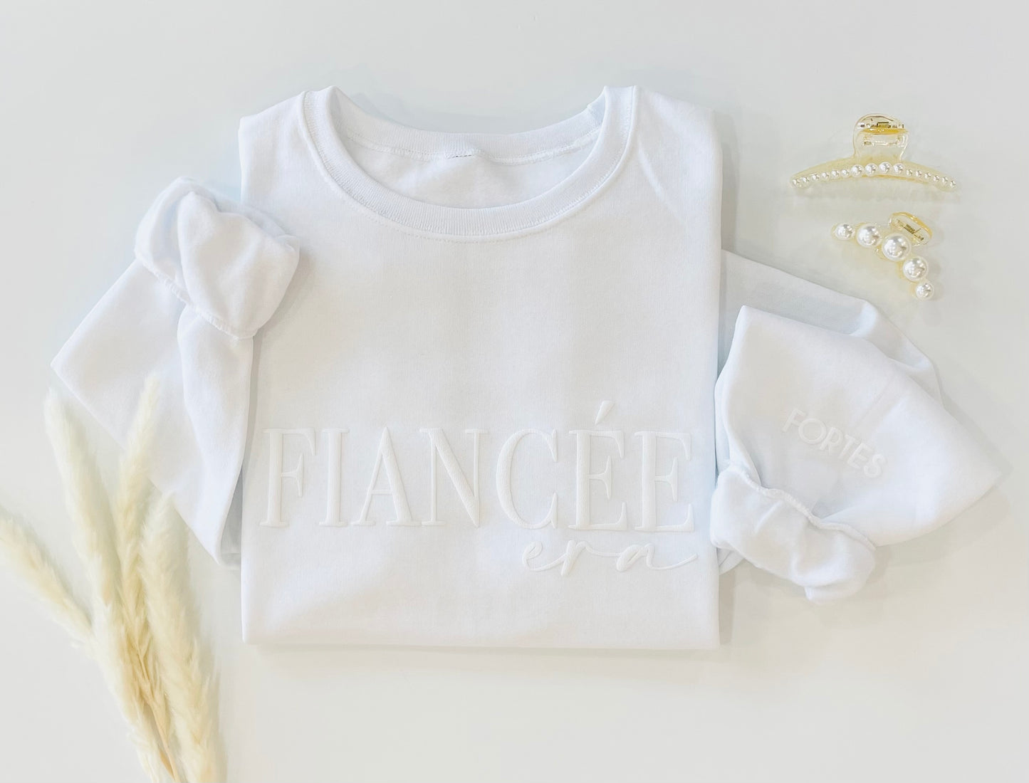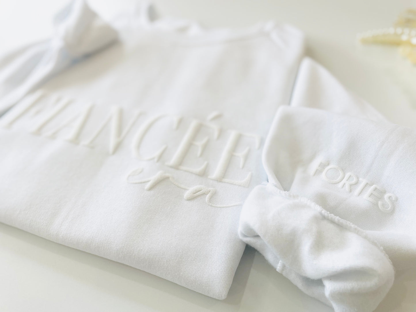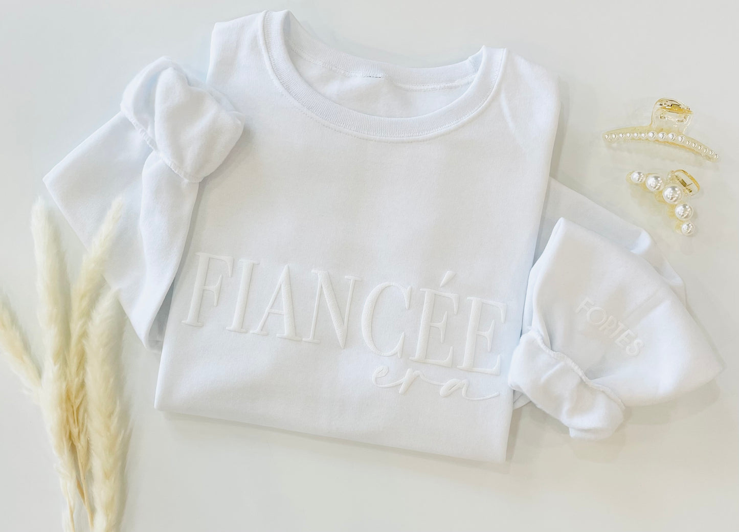 Celebrate your engagement in style with our Embossed Custom Fiancée Era Sweatshirt, designed specifically for the chic bride-to-be. This sweatshirt is not just a garment; it's a representation of love and excitement for the journey ahead.