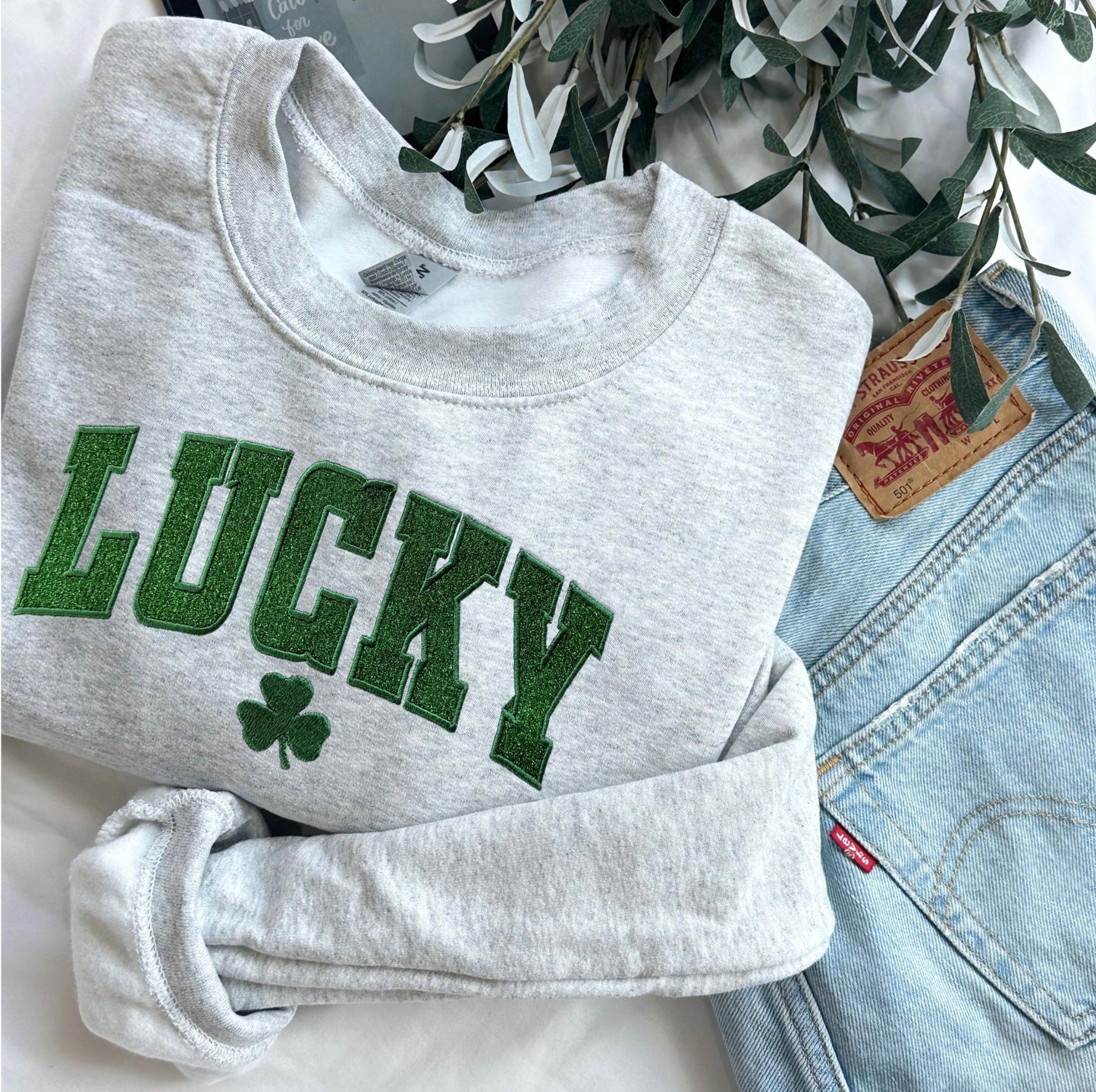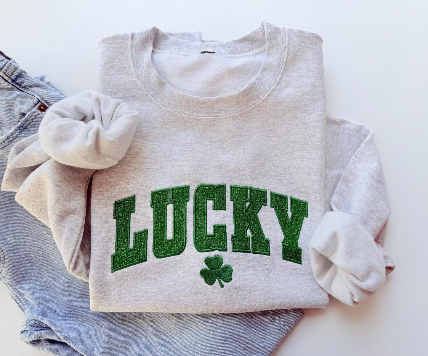 Get ready to sparkle this St. Patrick's Day with the Embroidered Glitter Lucky Sweatshirt! This festive sweatshirt features an elegant "Lucky" design with glittery embroidery that adds a touch of shimmer to your celebration.