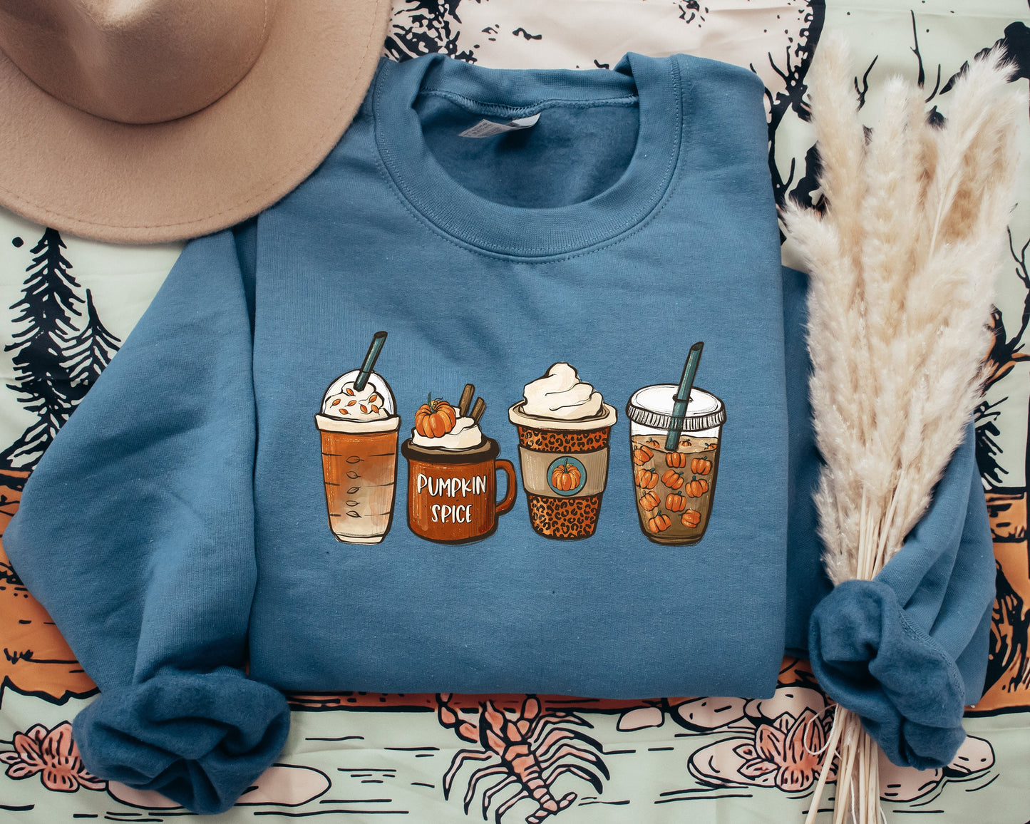 Embrace the essence of autumn and your love for coffee with our Four Coffee Pumpkin Spice Sweatshirt. This charming sweatshirt features a delightful design of four coffee cups, each symbolizing the perfect brew to match your mood!