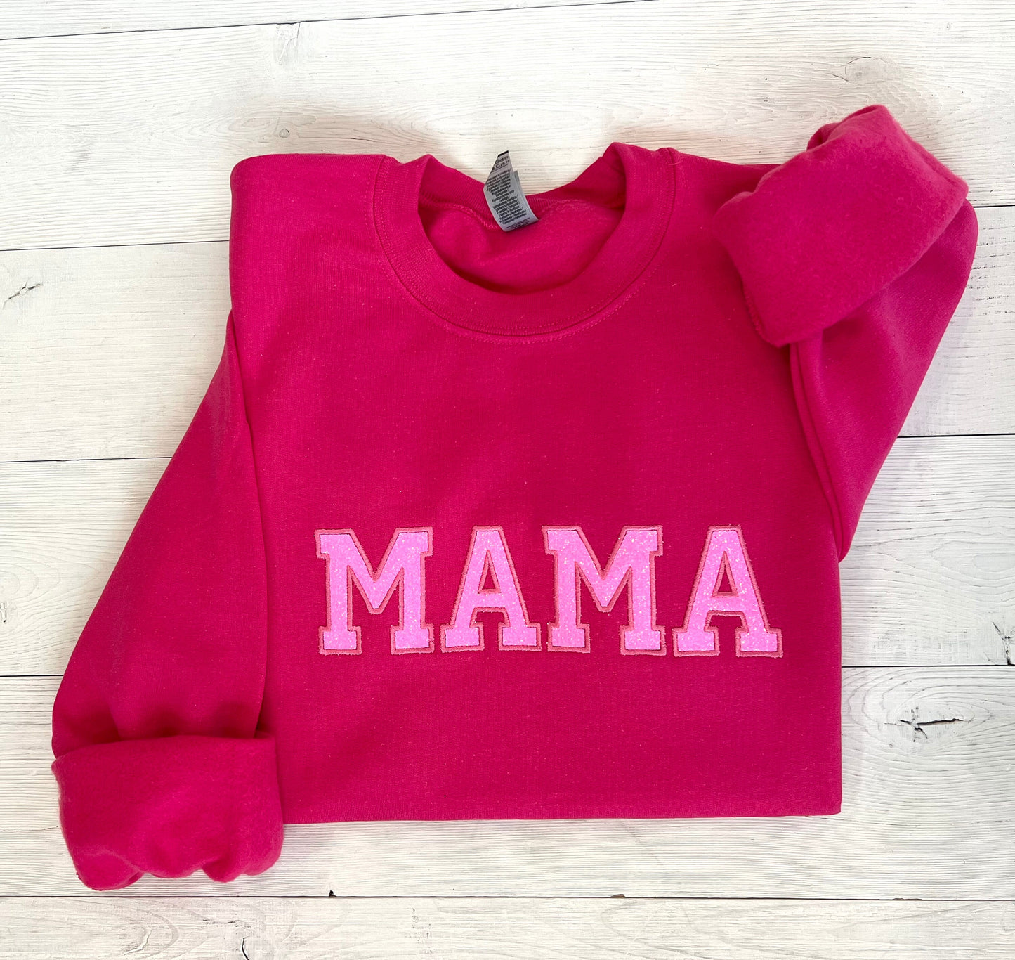 Elevate Your Wardrobe with Our Glitter Applique Embroidered Hot Pink Mama Sweatshirt
