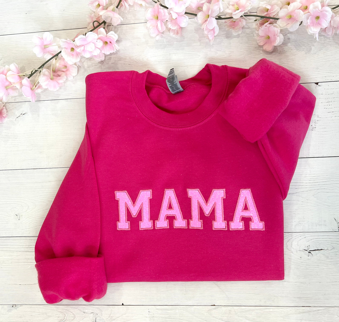 Whether you're a proud mama or looking for a thoughtful gift, this sweatshirt embodies love and style. Its unique design not only signifies your role but also allows you to shine wherever you go. Embrace the comfort and sparkle of our Glitter Applique Embroidered Hot Pink Mama Sweatshirt and showcase your vibrant personality!