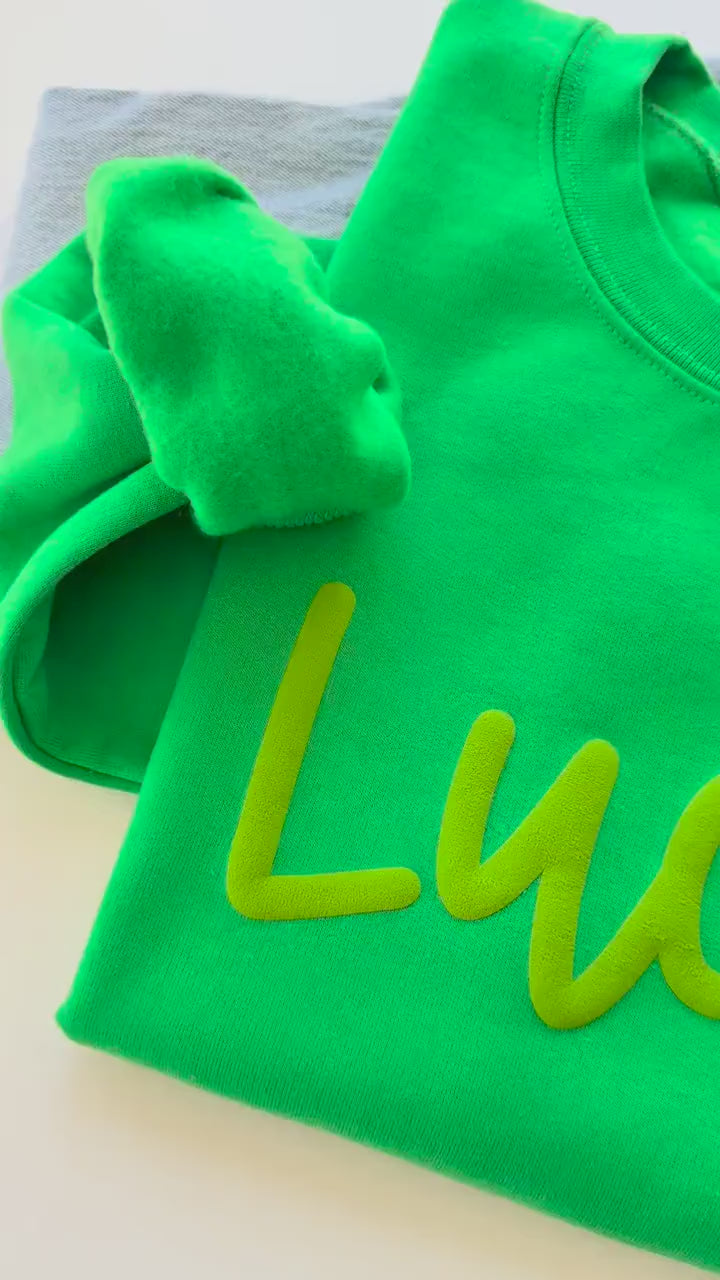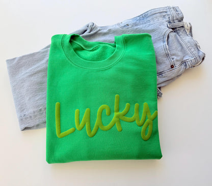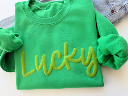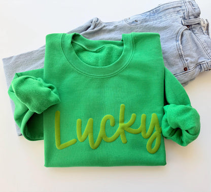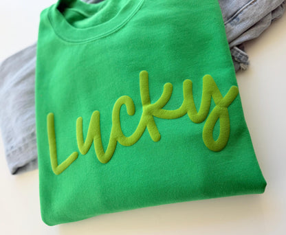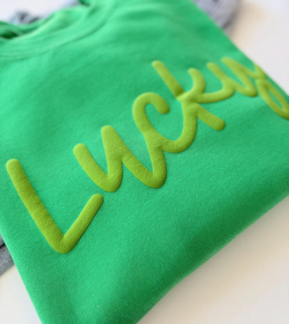Embrace the spirit of St. Patrick's Day with our Irish Green Lucky Sweatshirt. This vibrant green sweatshirt is adorned with the word 'Lucky' in bold, festive typography, making it a standout piece for any celebration.