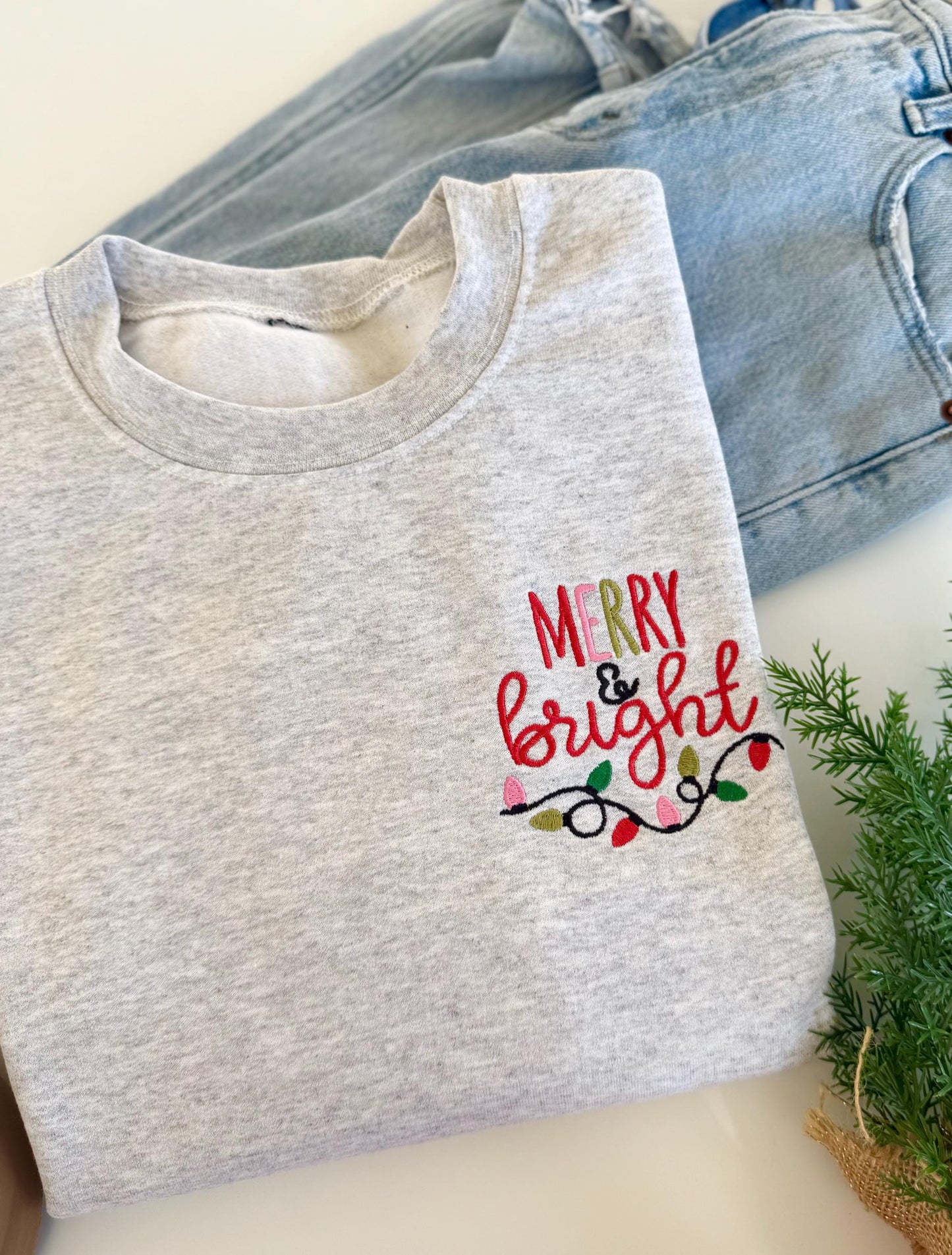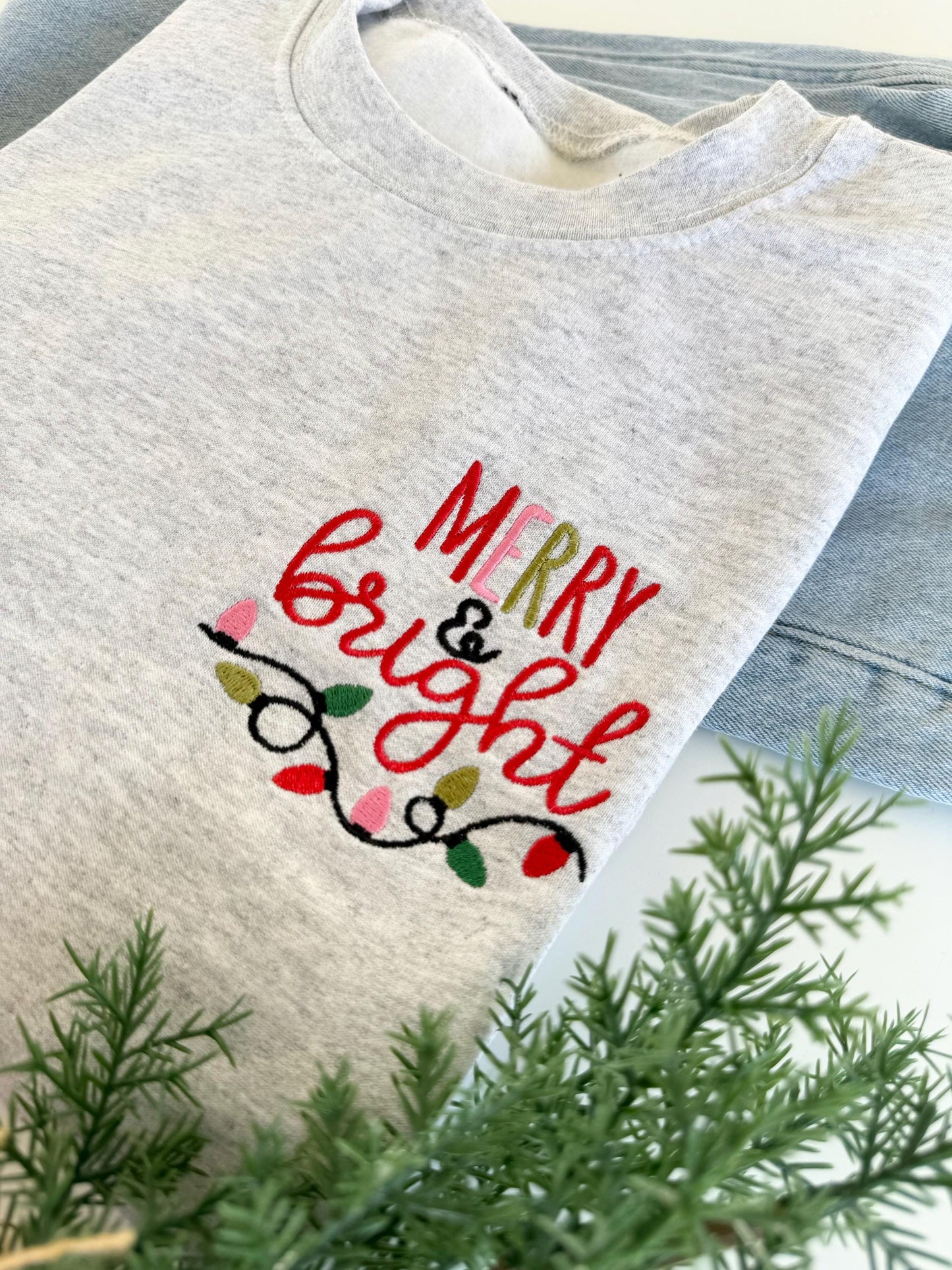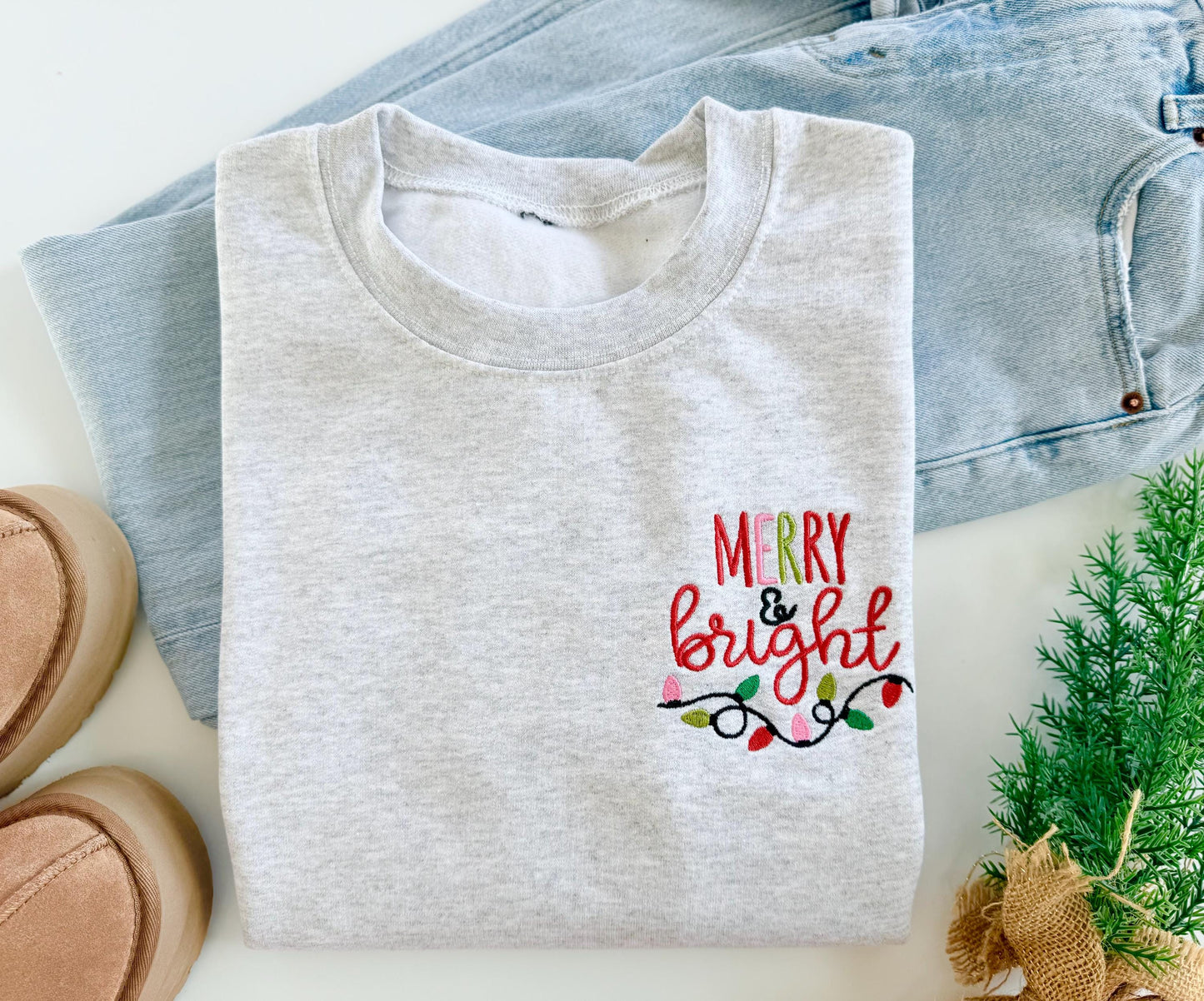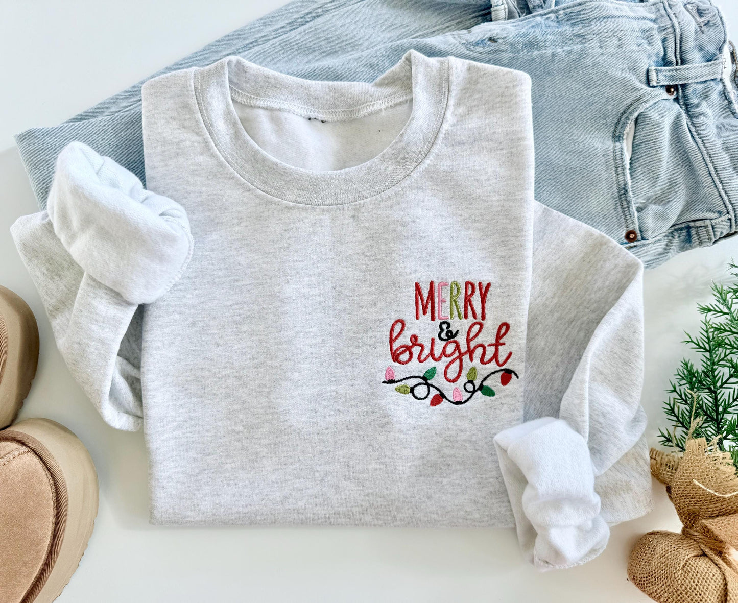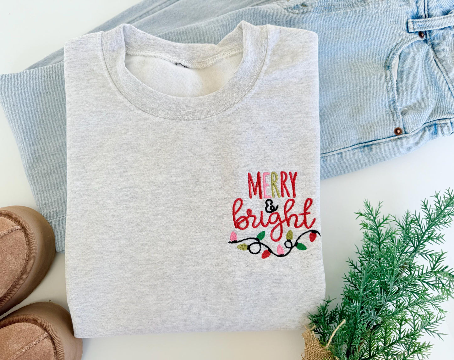 Merry & Bright Embroidered Christmas Sweatshirt - Womens Christmas Sweater