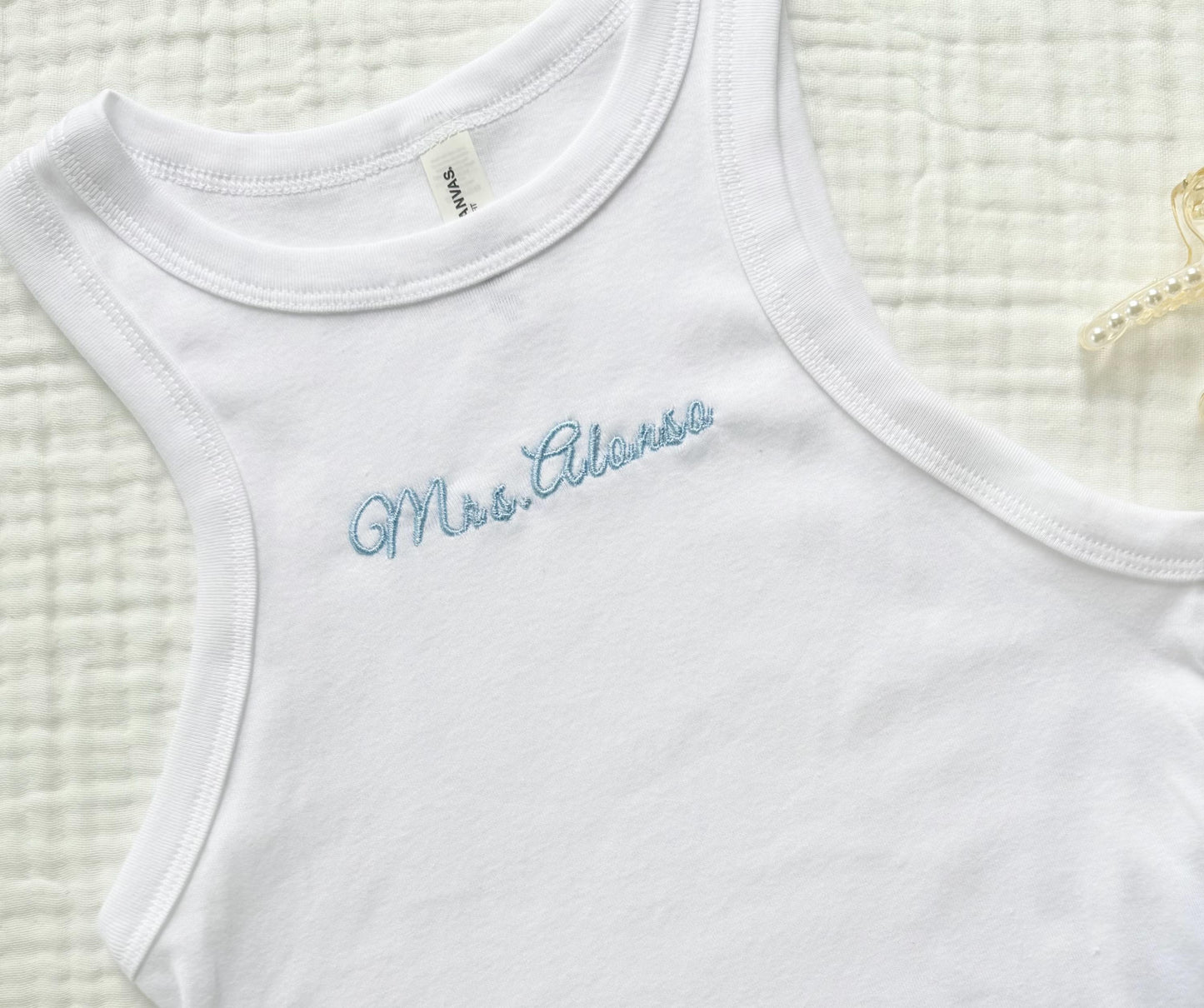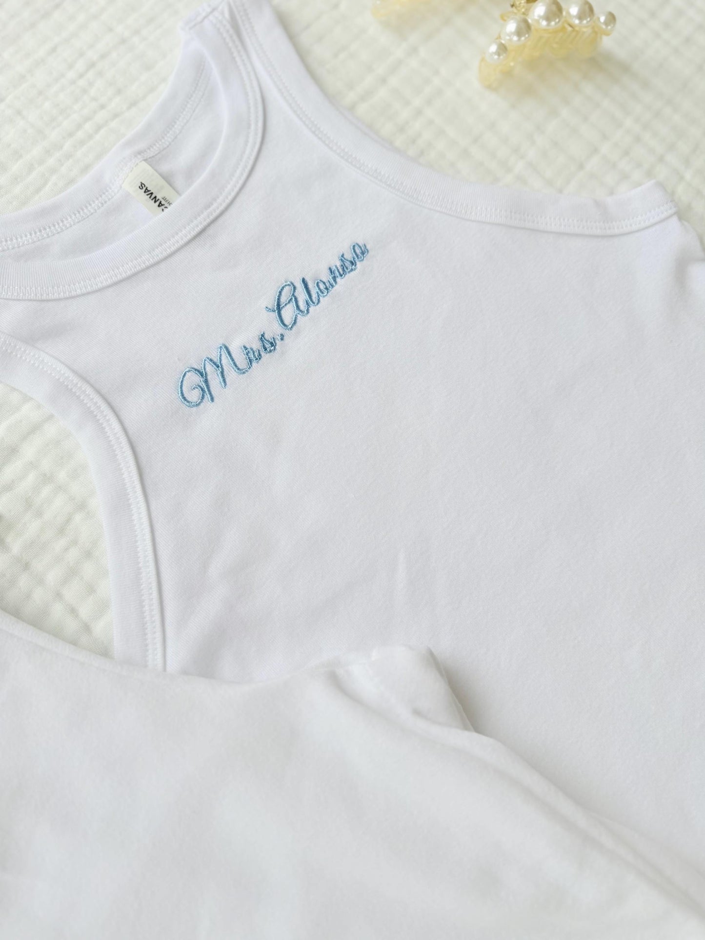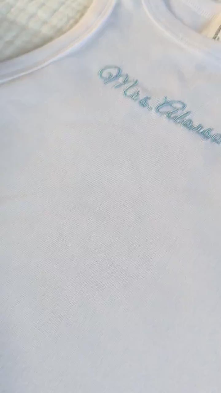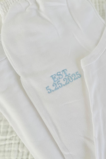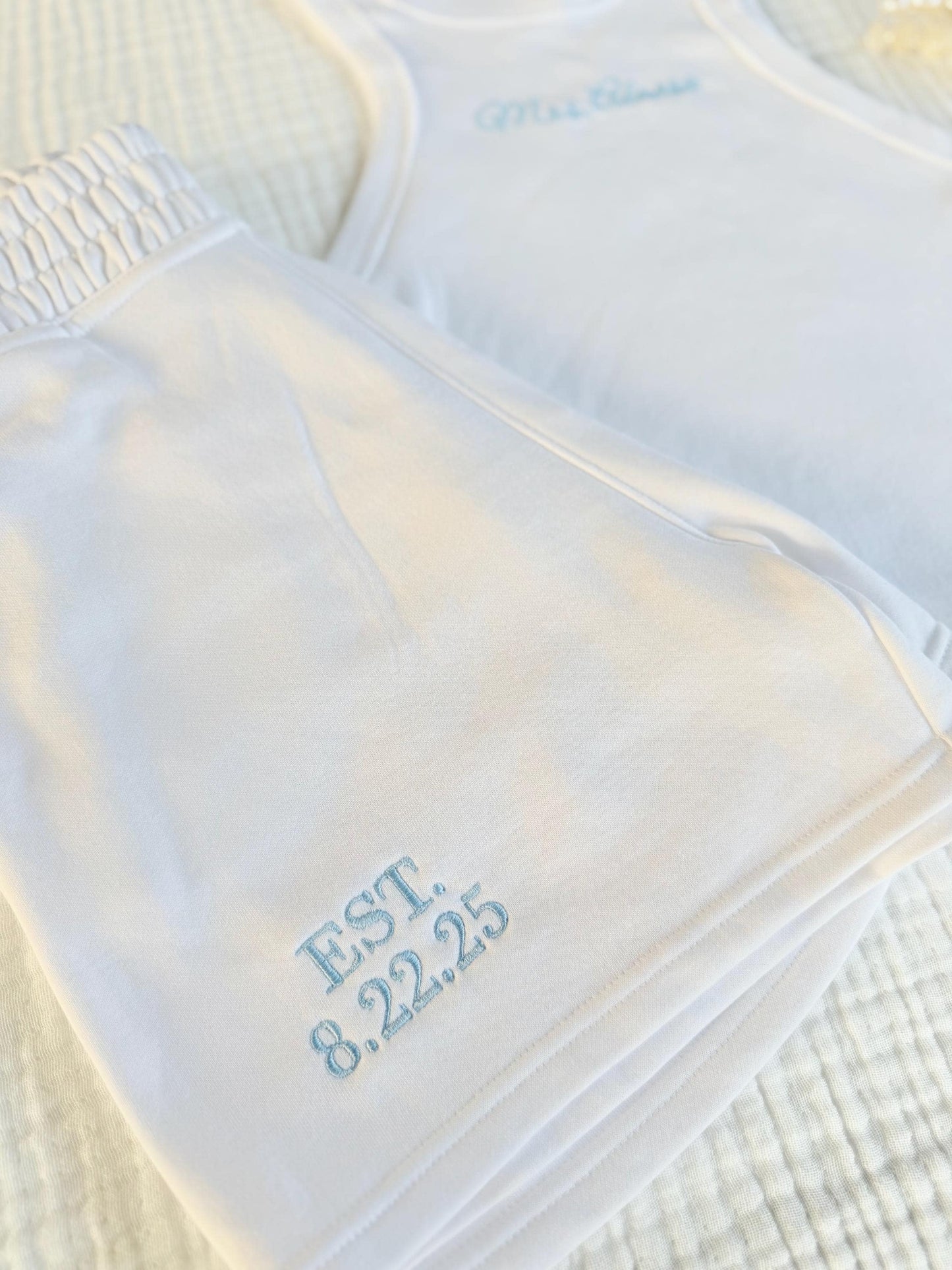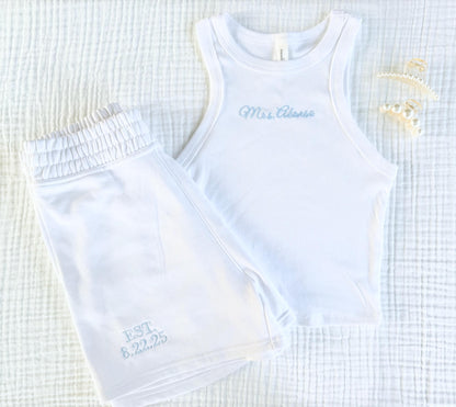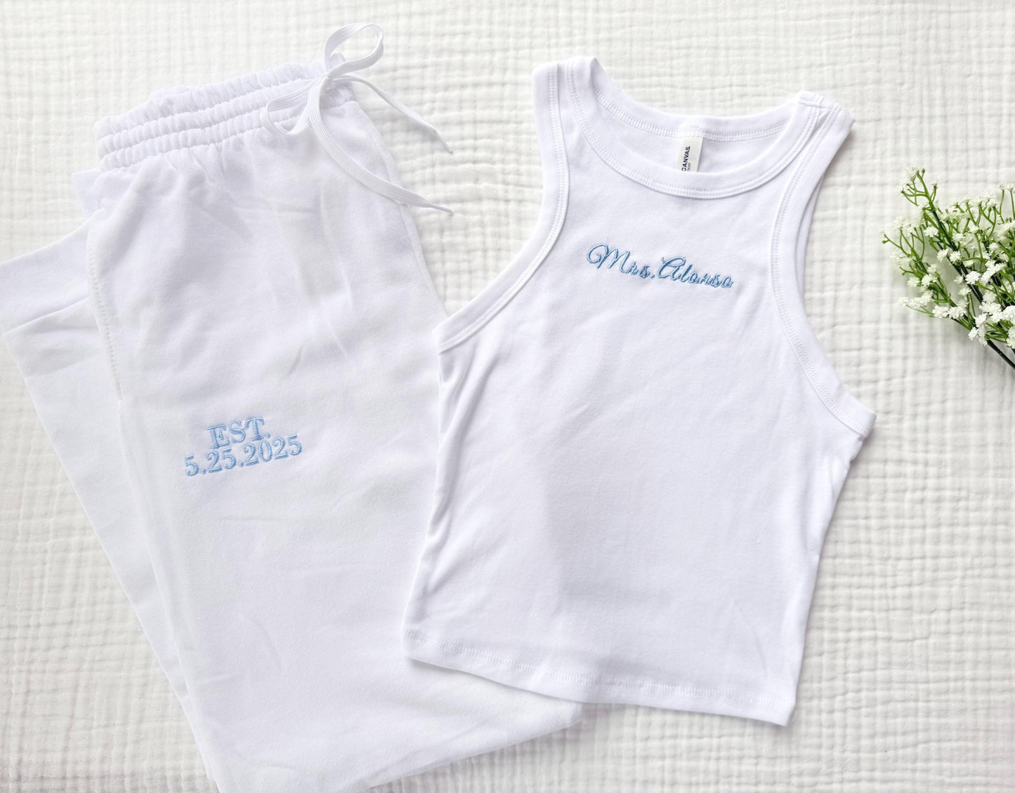 Celebrate your new last name in style with our cozy and chic custom lounge set! This bridal set includes a soft white cami top embroidered with your name and matching white sweatpants featuring your wedding date.
