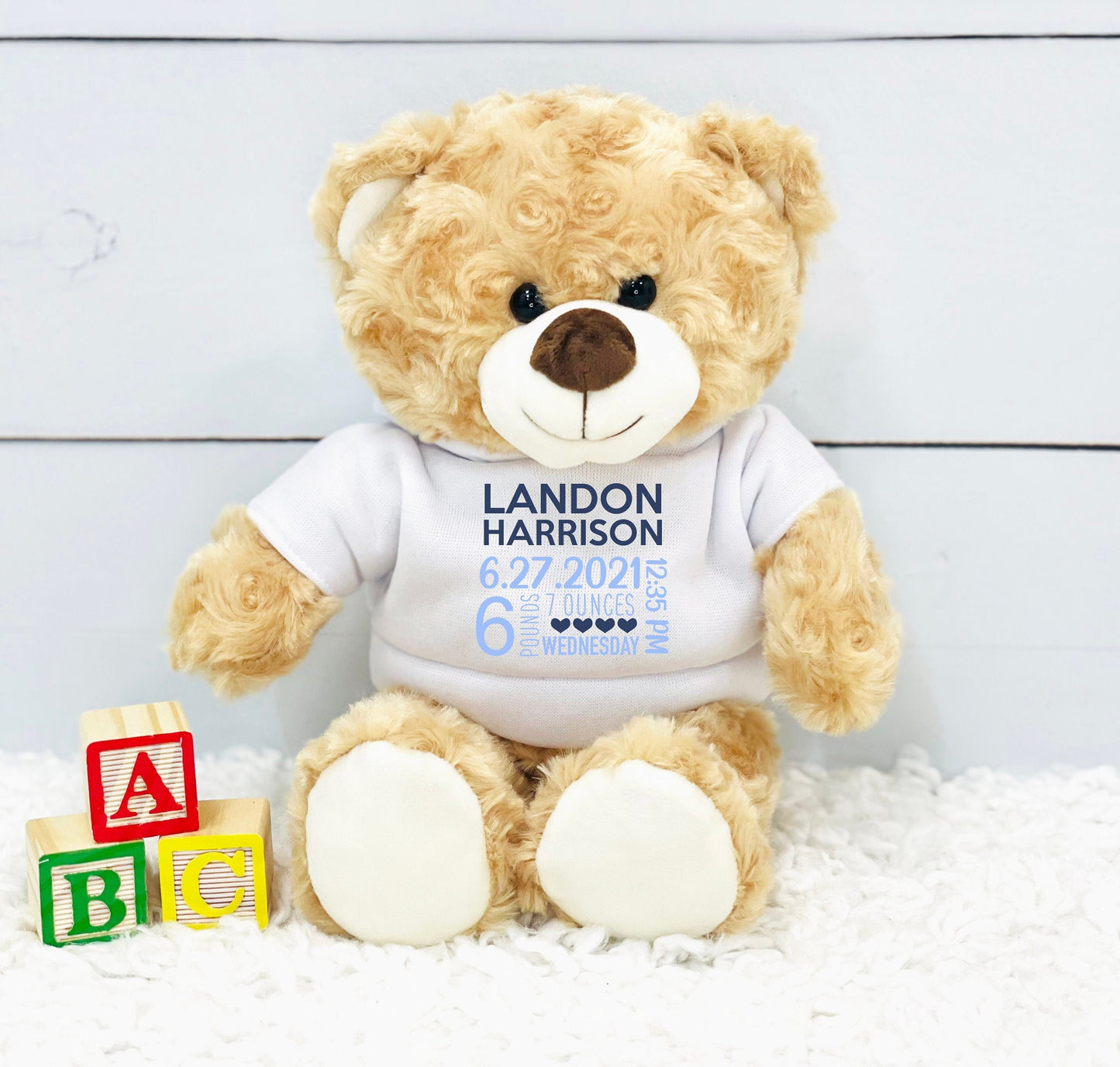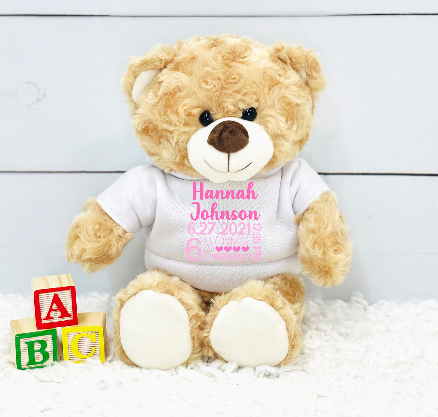 Give the gift of love and memories with our Personalized Stuffed Teddy Bear! This soft and huggable bear is the perfect keepsake for celebrating a new baby. Customize it with the baby’s birth statistics, including name, date, time, weight, and length. Whether for a nursery decoration, a baby shower, or a lifelong treasure, this teddy bear is sure to bring smiles and warmth.