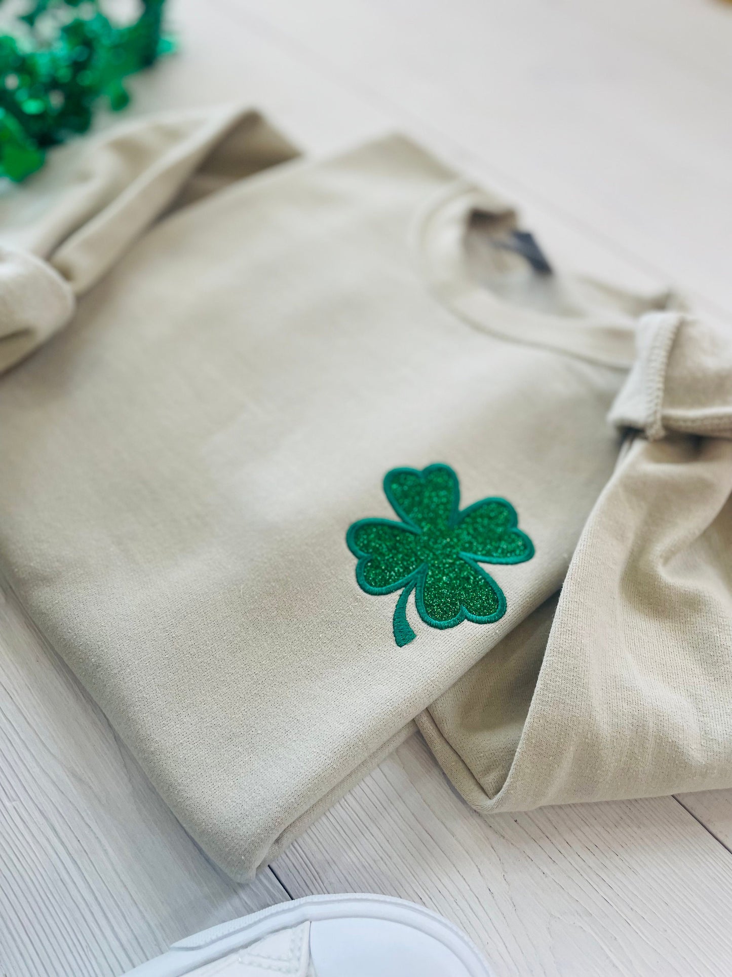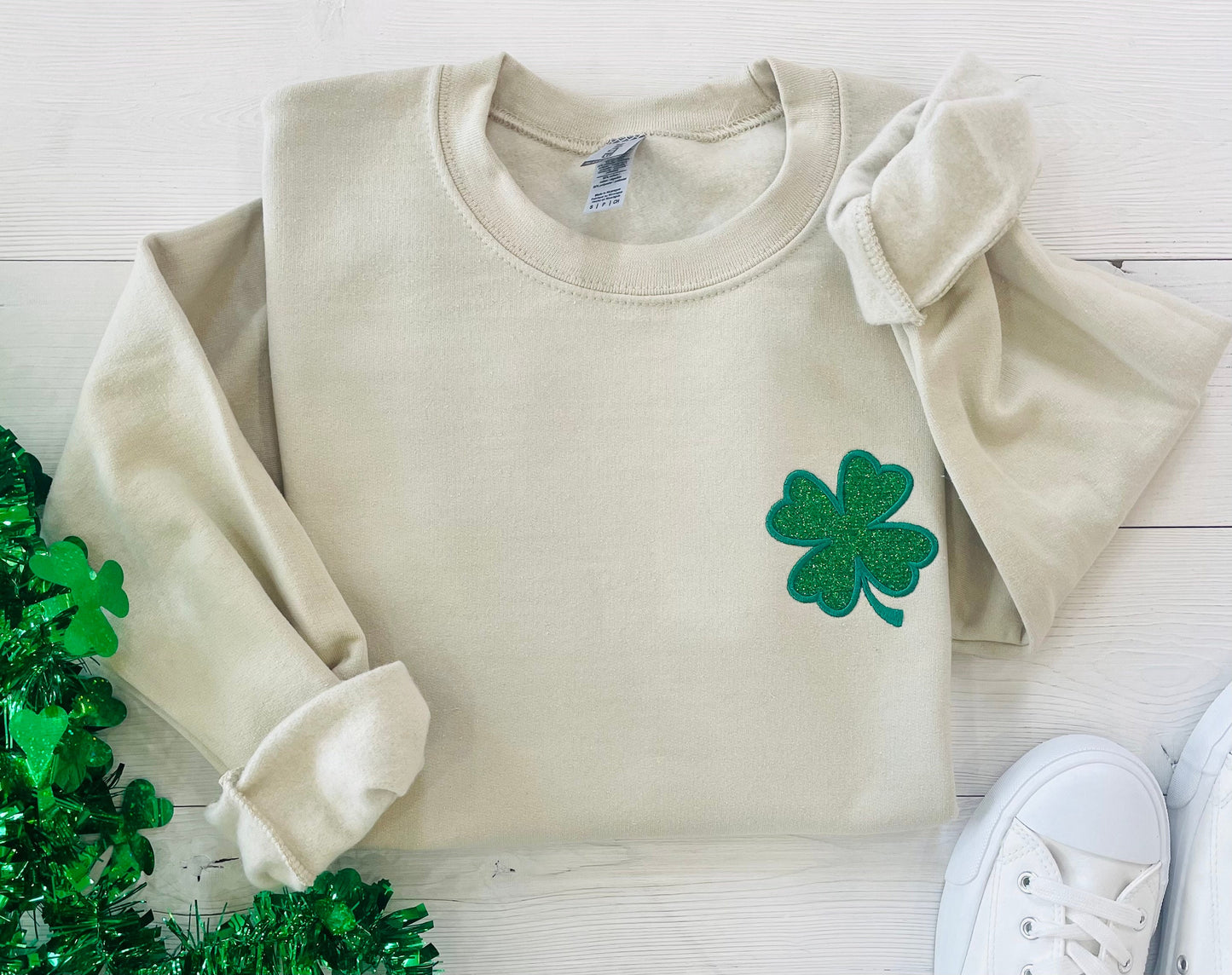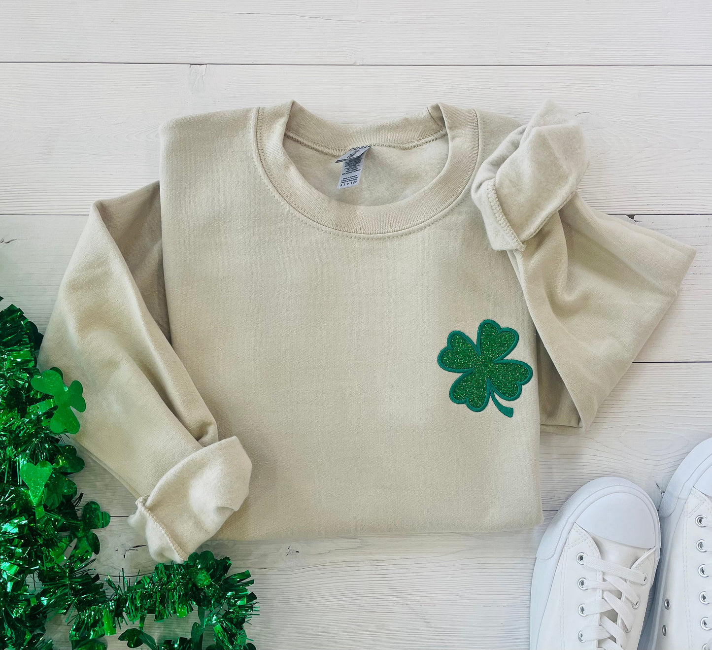 Pocket Glitter Embroidered Four Leaf Clover Sweatshirt