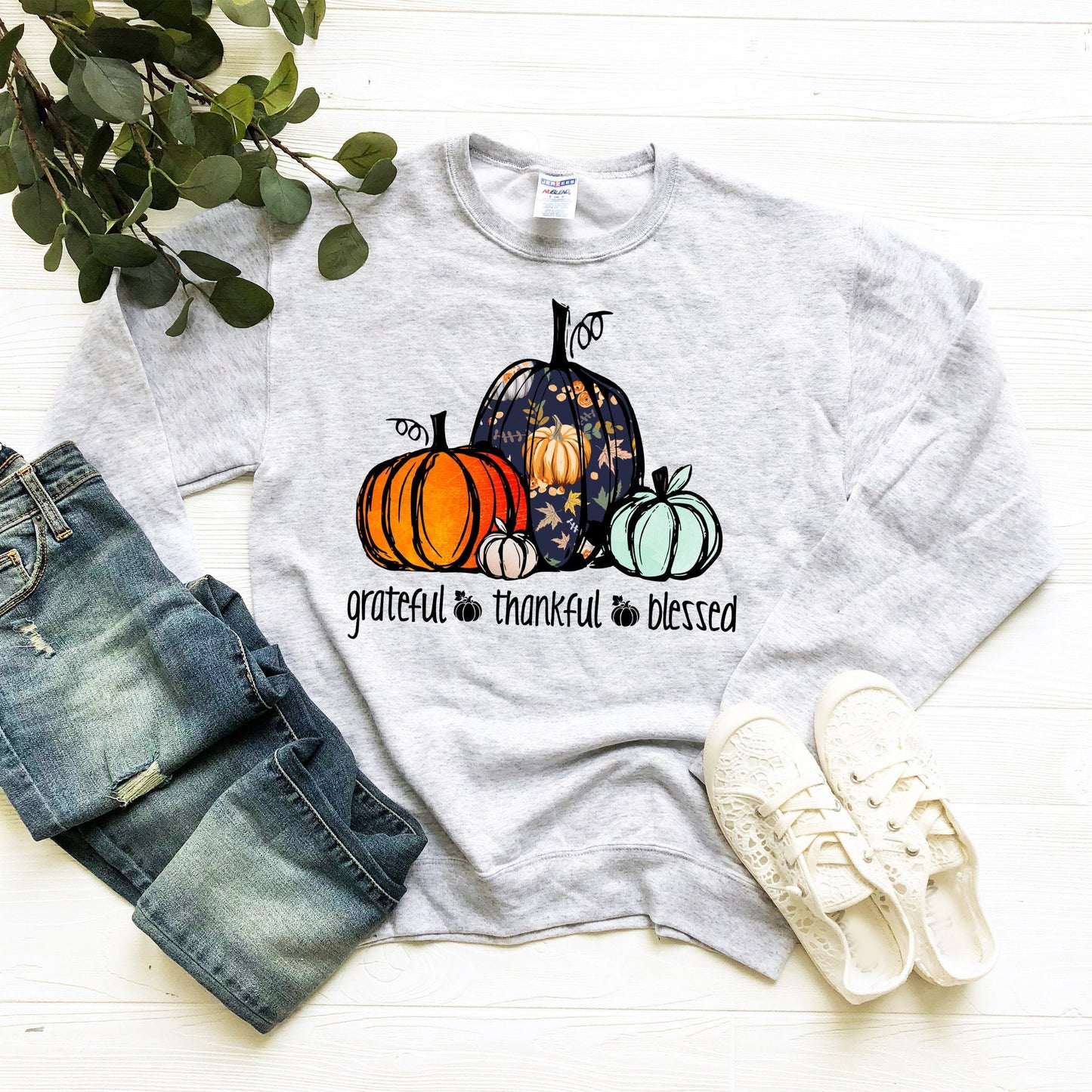 Embrace the spirit of gratitude and warmth with our Thankful Grateful Blessed Four Pumpkin Crewneck. This cozy crewneck sweater is perfect for those crisp autumn days, bringing together comfort and a festive touch.