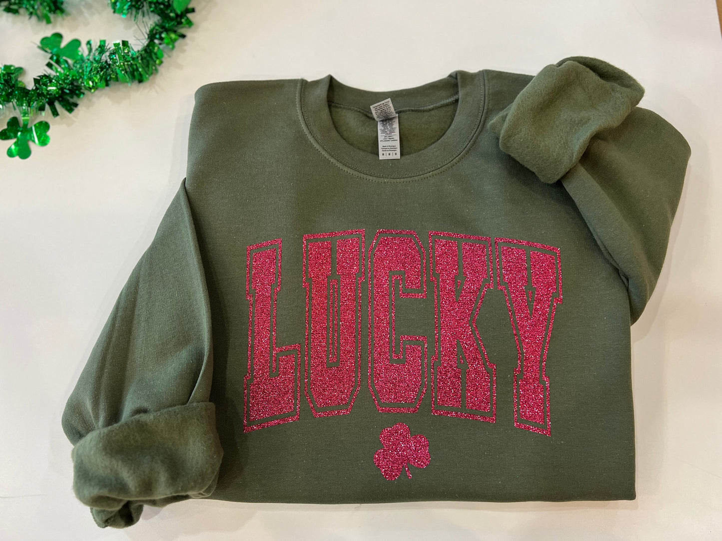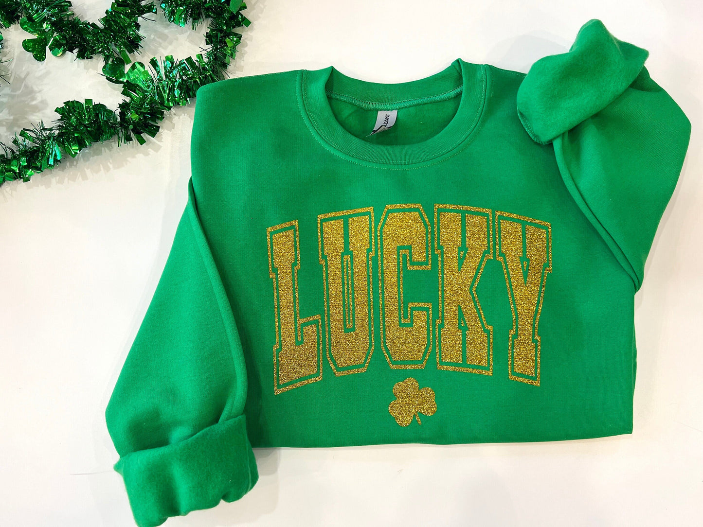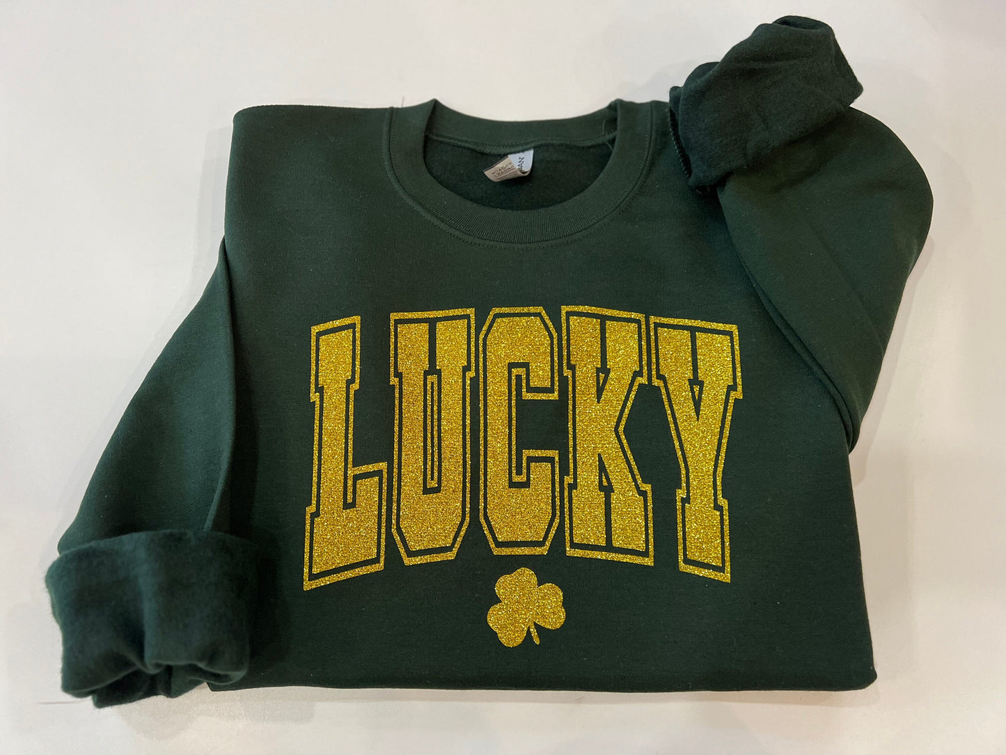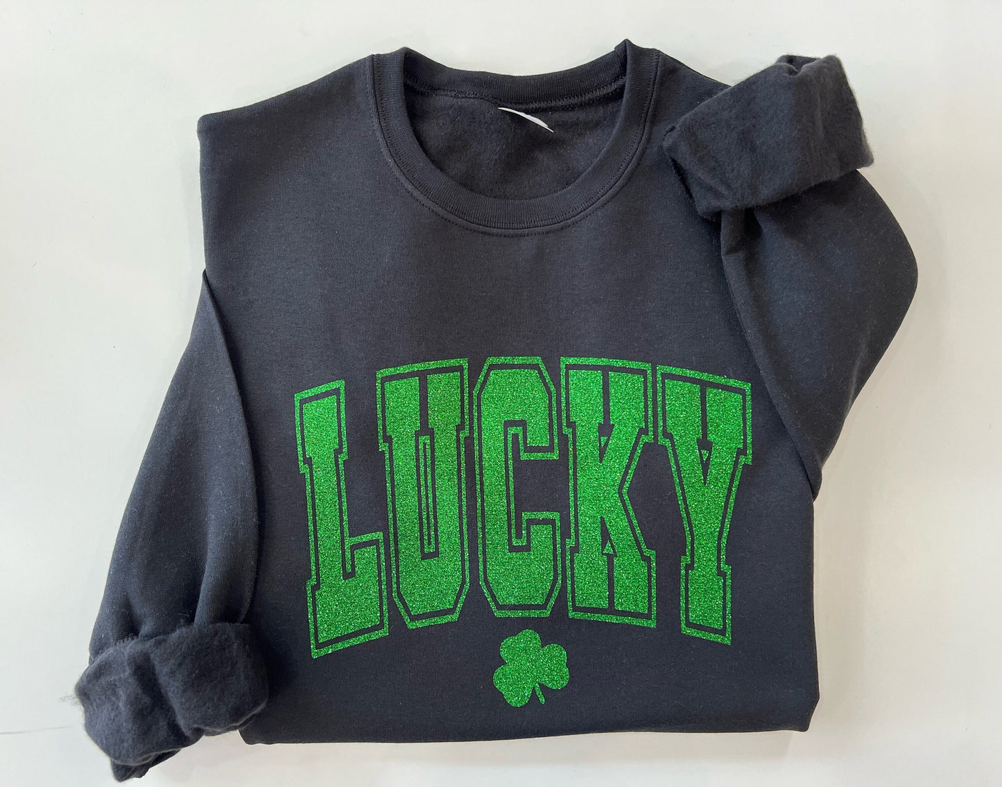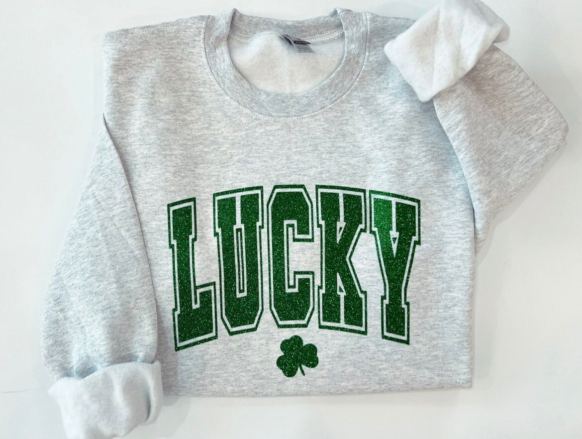 Varsity lucky crewneck, glitter St. Patricks day shirt, clover glitter st. paddys day sweater, Lucky with shamrock top, irish parade shirt