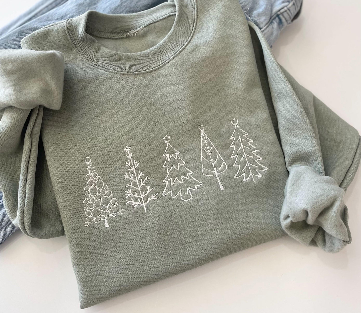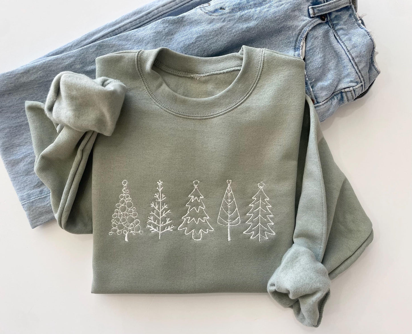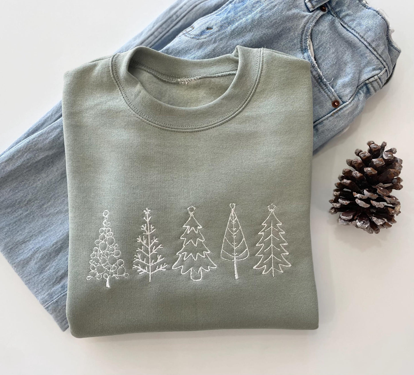 Celebrate the holiday spirit in style with our Five Christmas Embroidered Tree Sweatshirt! Adorned with delicate embroidered Christmas trees, this snug crewneck is a must-have for the season.