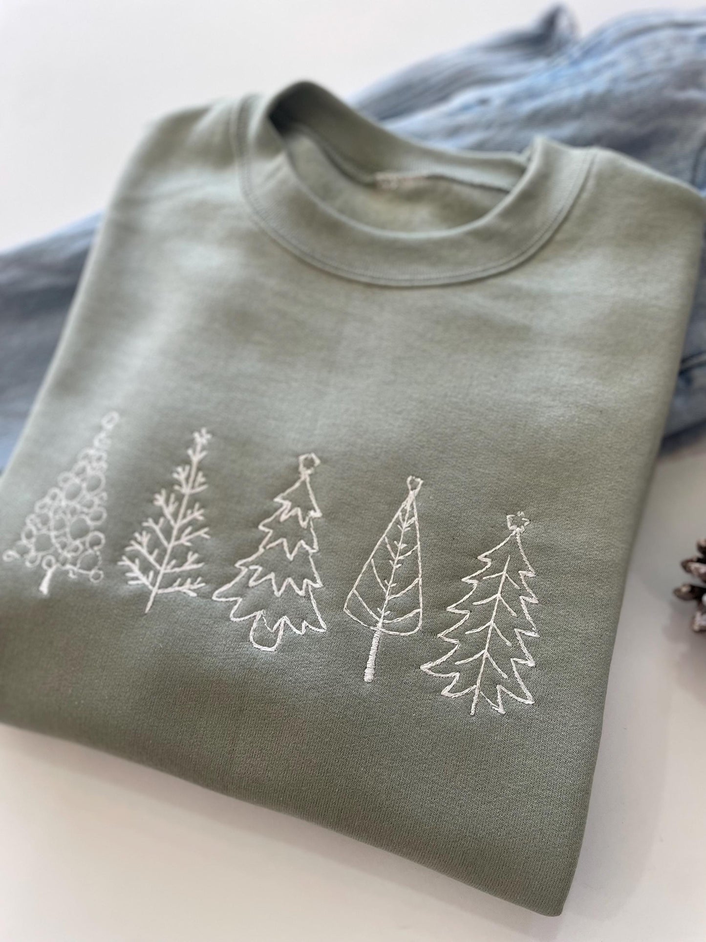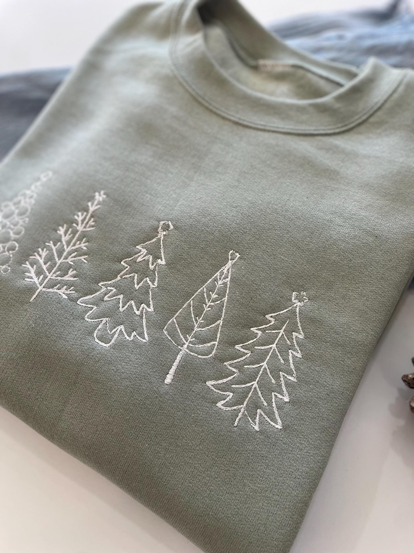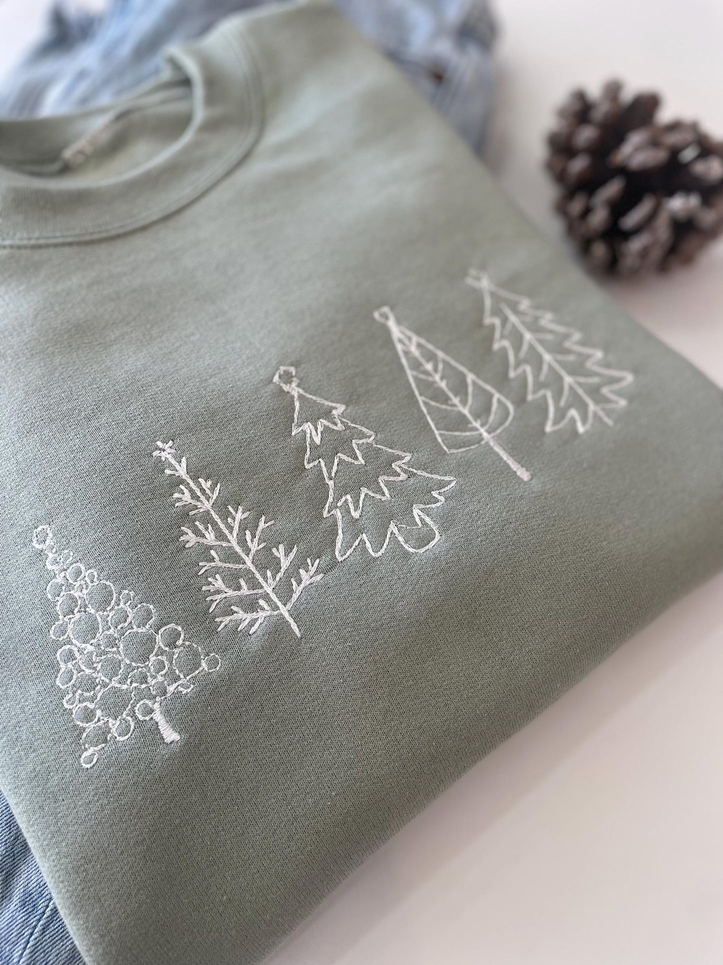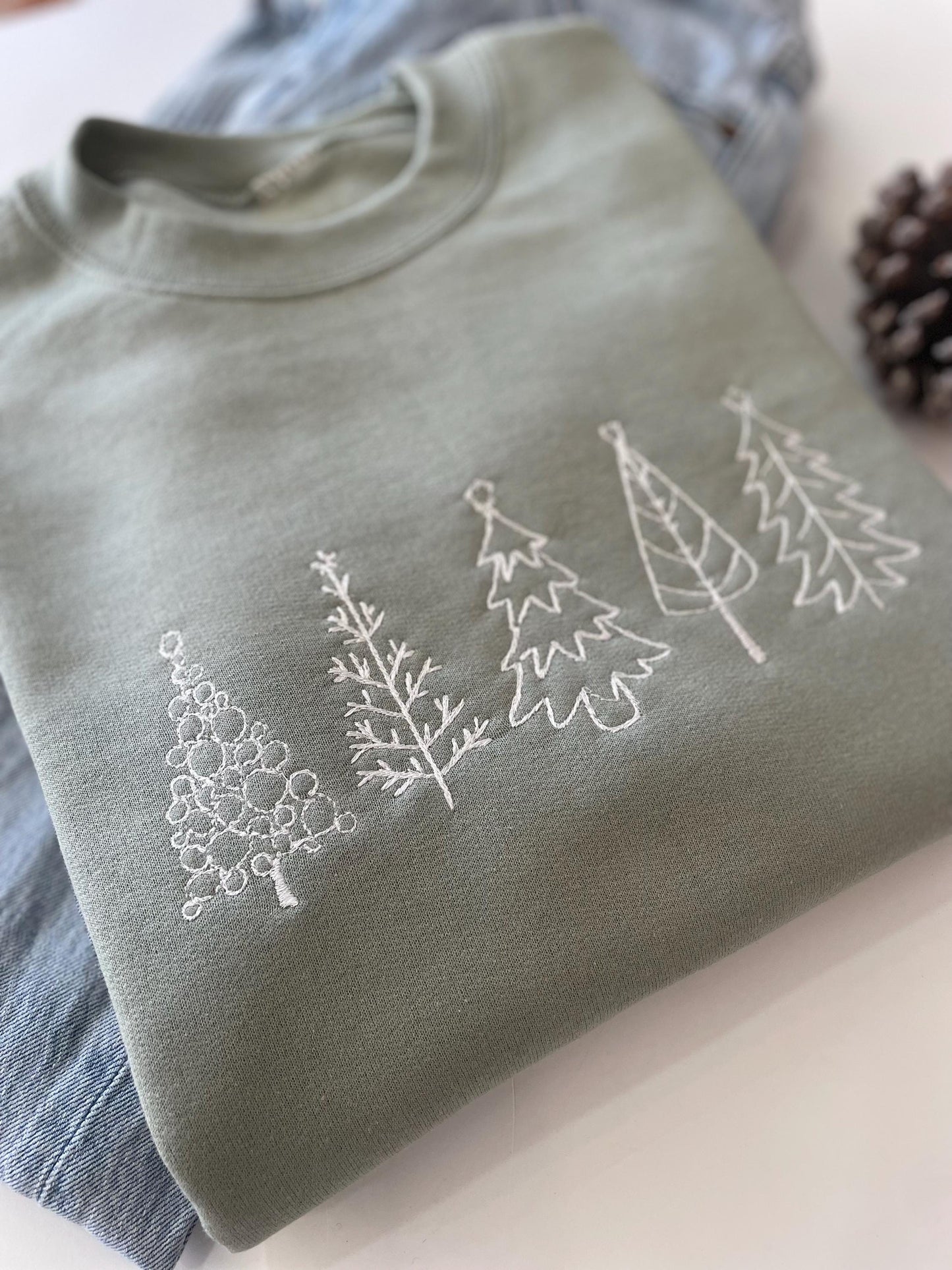 Celebrate the holiday spirit in style with our Five Christmas Embroidered Tree Sweatshirt! Adorned with delicate embroidered Christmas trees, this snug crewneck is a must-have for the season.
