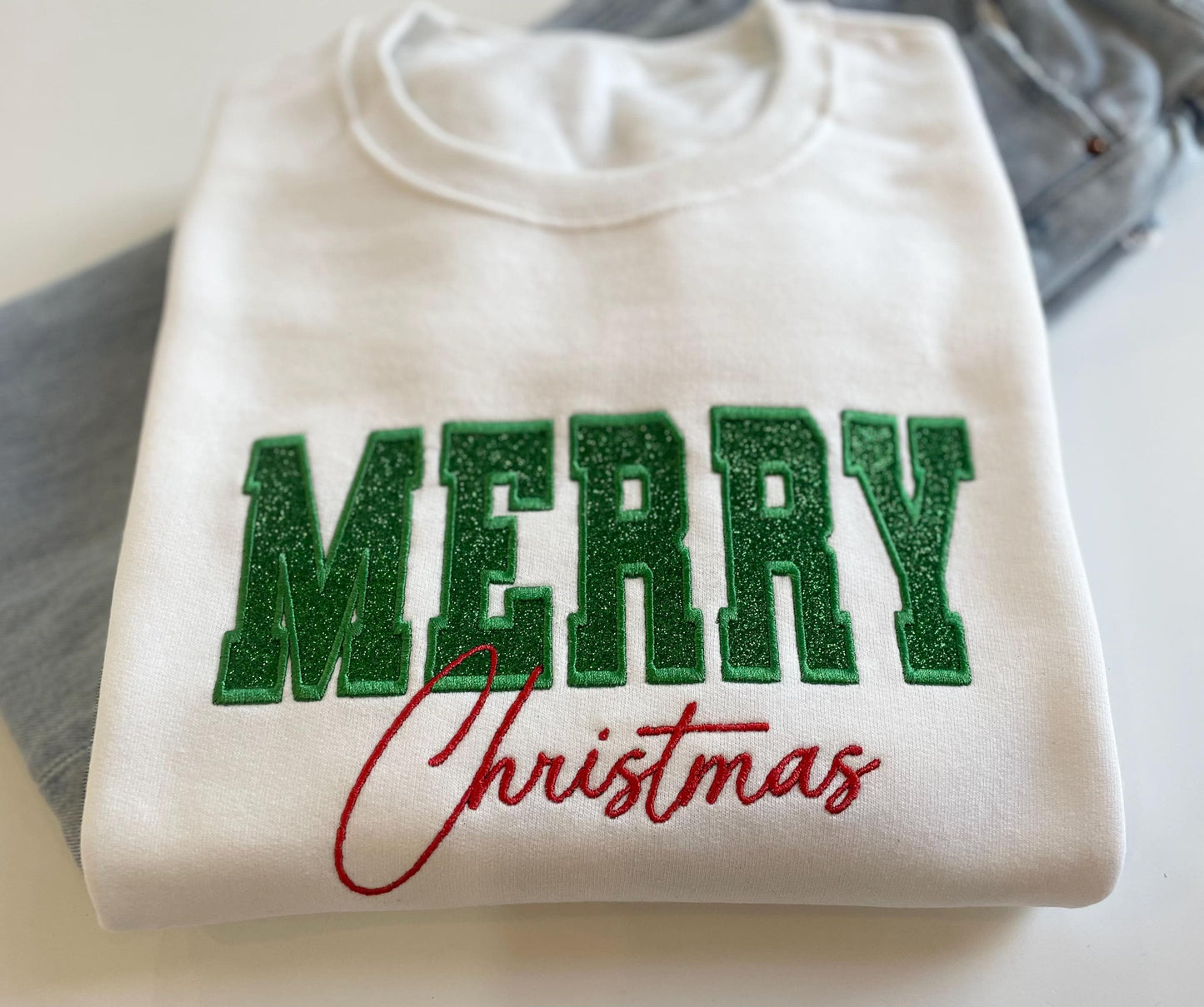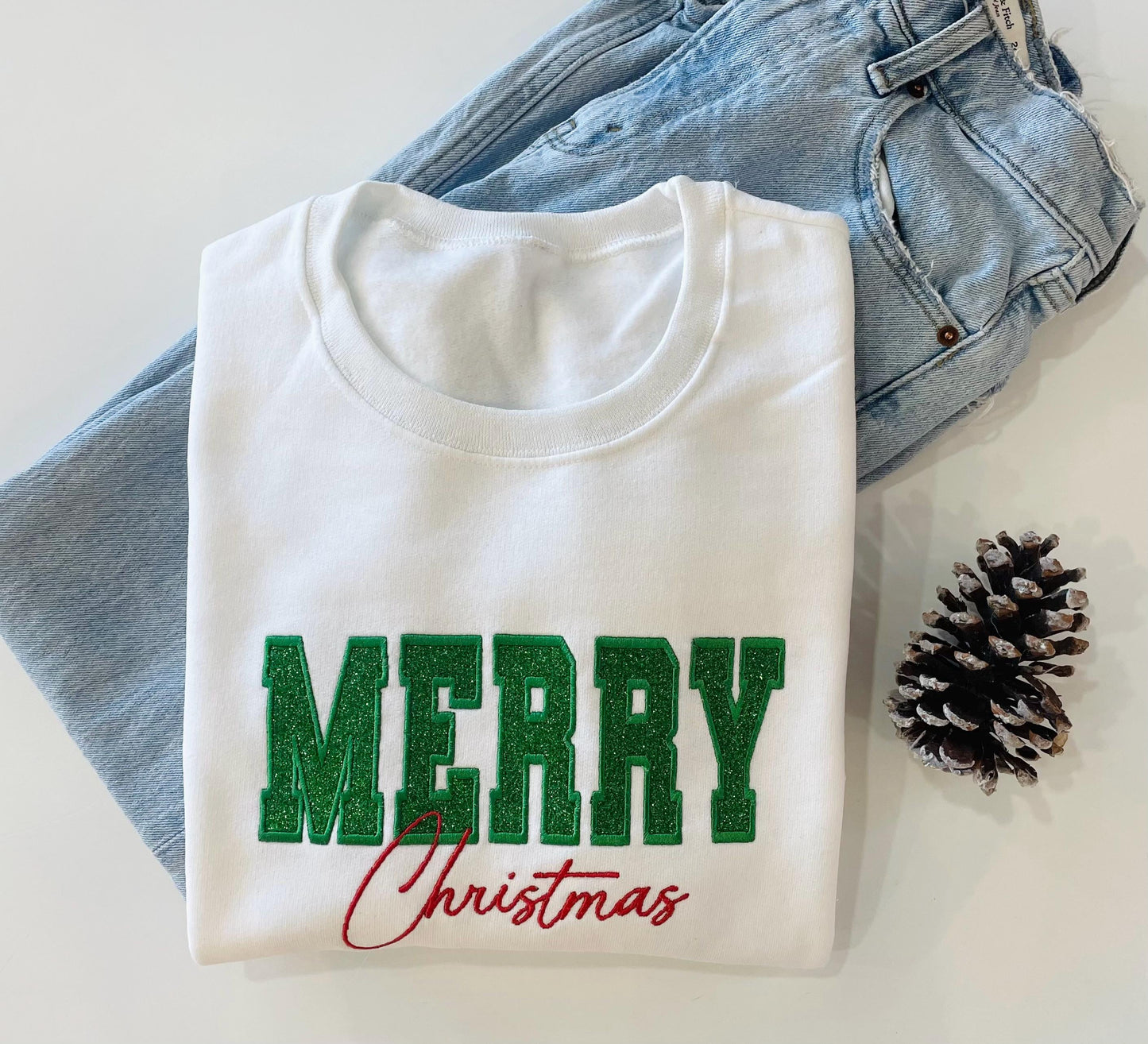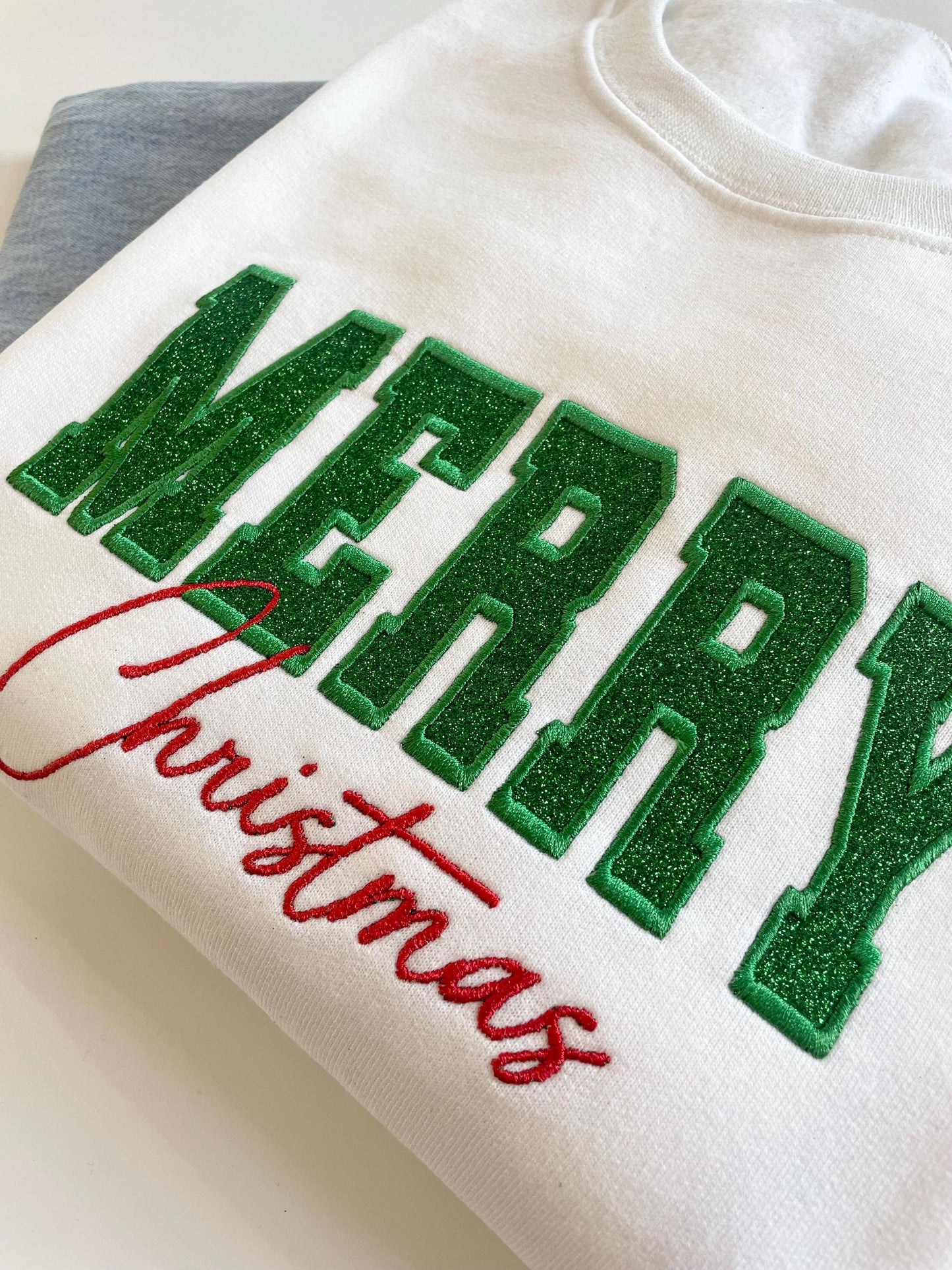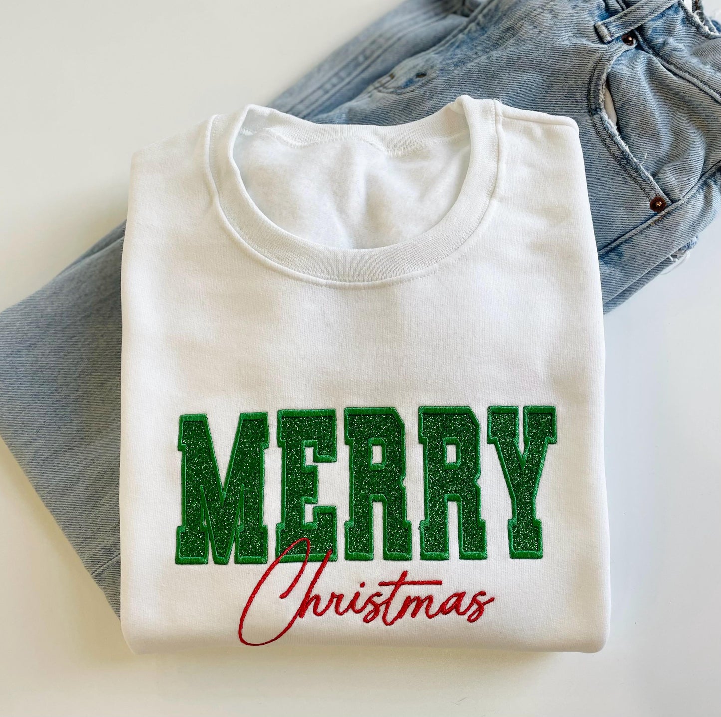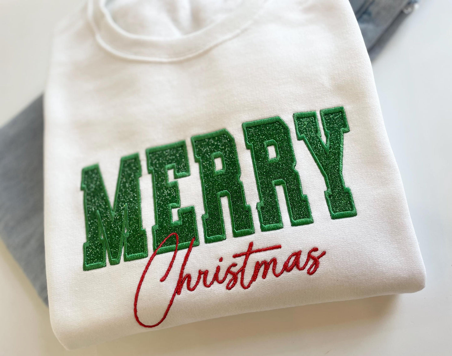 Women's Merry Christmas Green Glitter Embroidered Sweatshirt